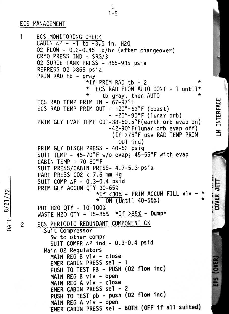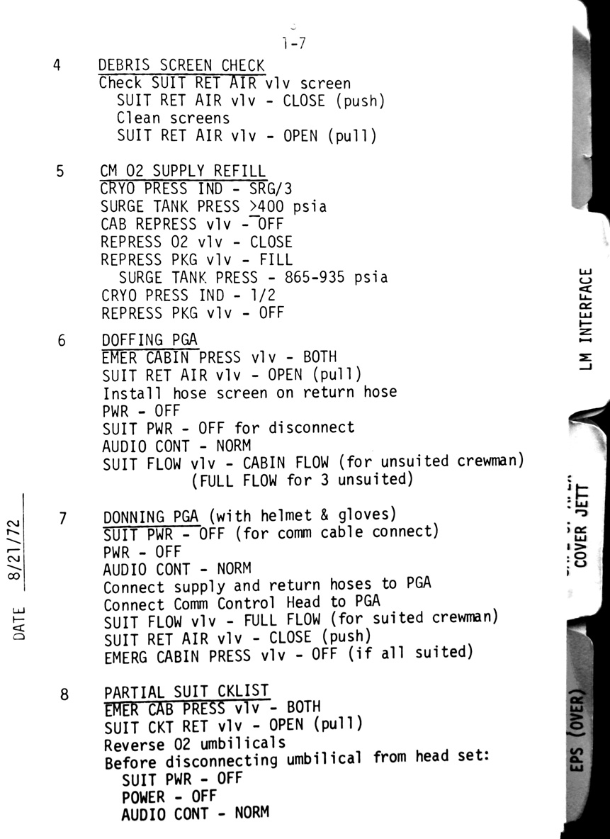 - 1-07 ECS - Debris screen check, CM O2 supply refill, Doff & don PGA, Partial suit checklist