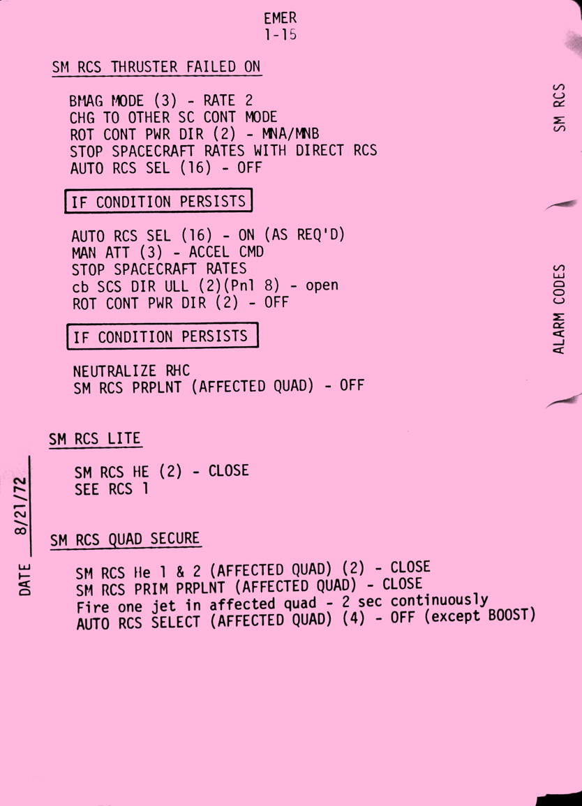 - emer1-15 SM RCS Thruster failed On, SM RCS light, SM RCS quad secure