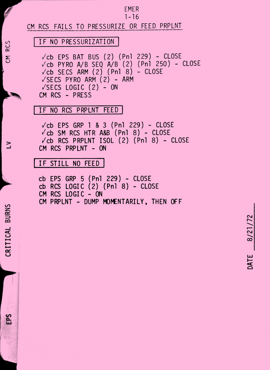 - emer1-16 CM RCS fails to pressurise or feed propellant