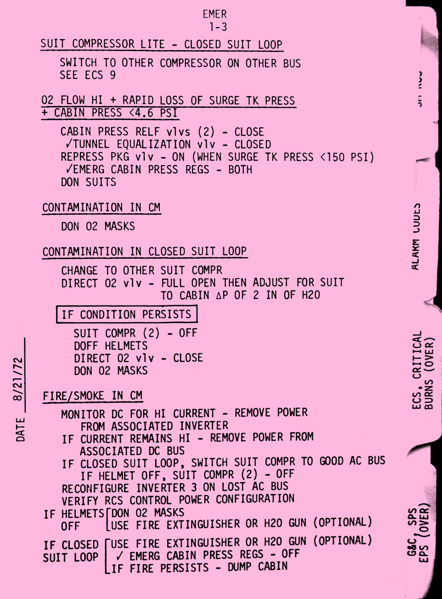 - emer1-03 Suit compressor light, O2 flow high & rapid loss of surge tank pressure, Contamination in CM, Contamination in closed suit loop, Fire/smoke in CM