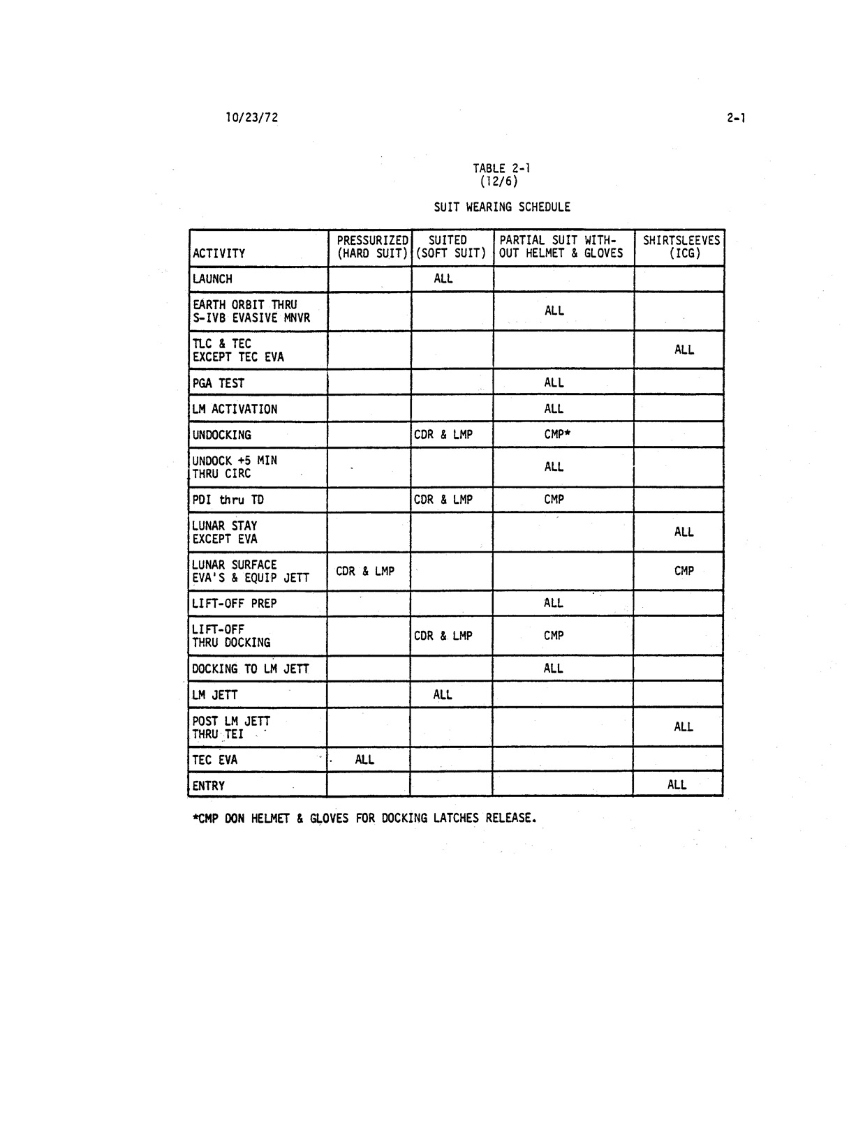 - 2-001 Table 2-1 - Suit wearing schedule