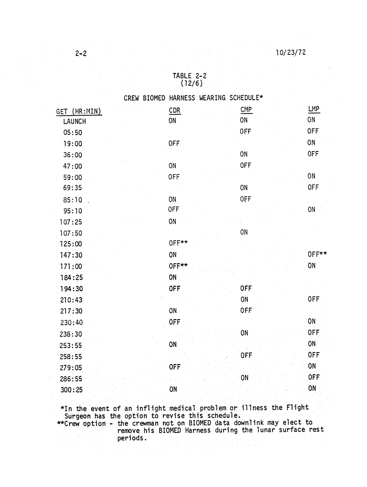 - 2-002 Table 2-2 - Crew biomed harness wearing schedule