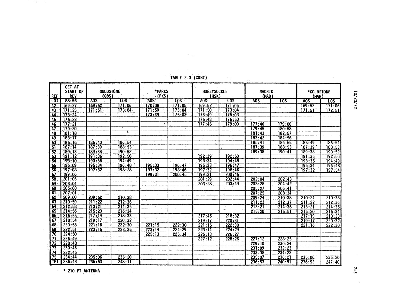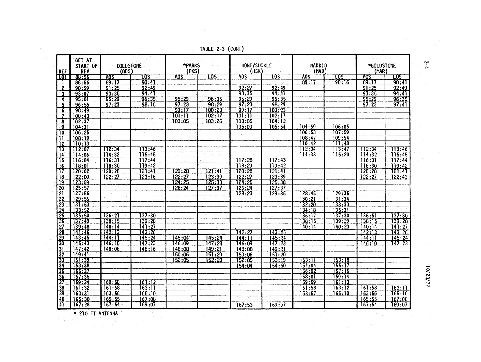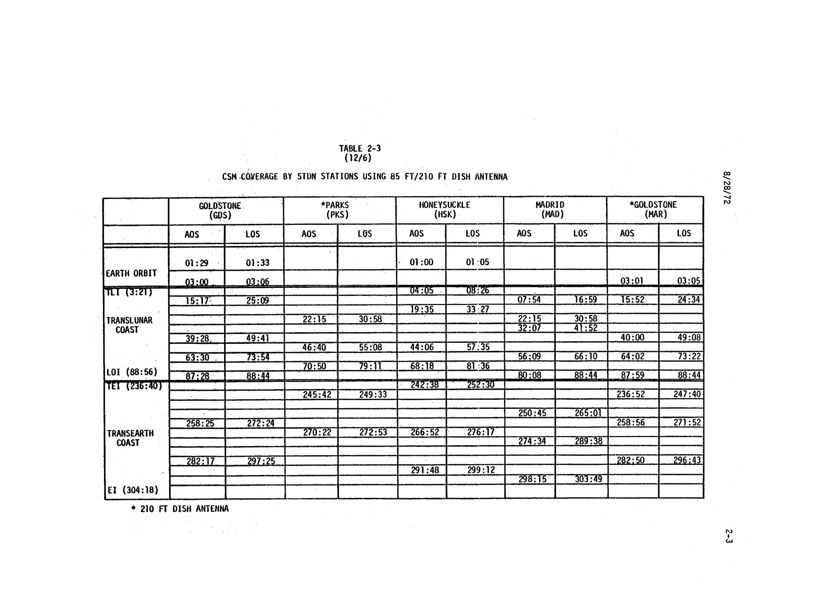 - 2-003 Table 2-3 - CSM coverage by STDN stations using 85-ft/210-ft dish antenna