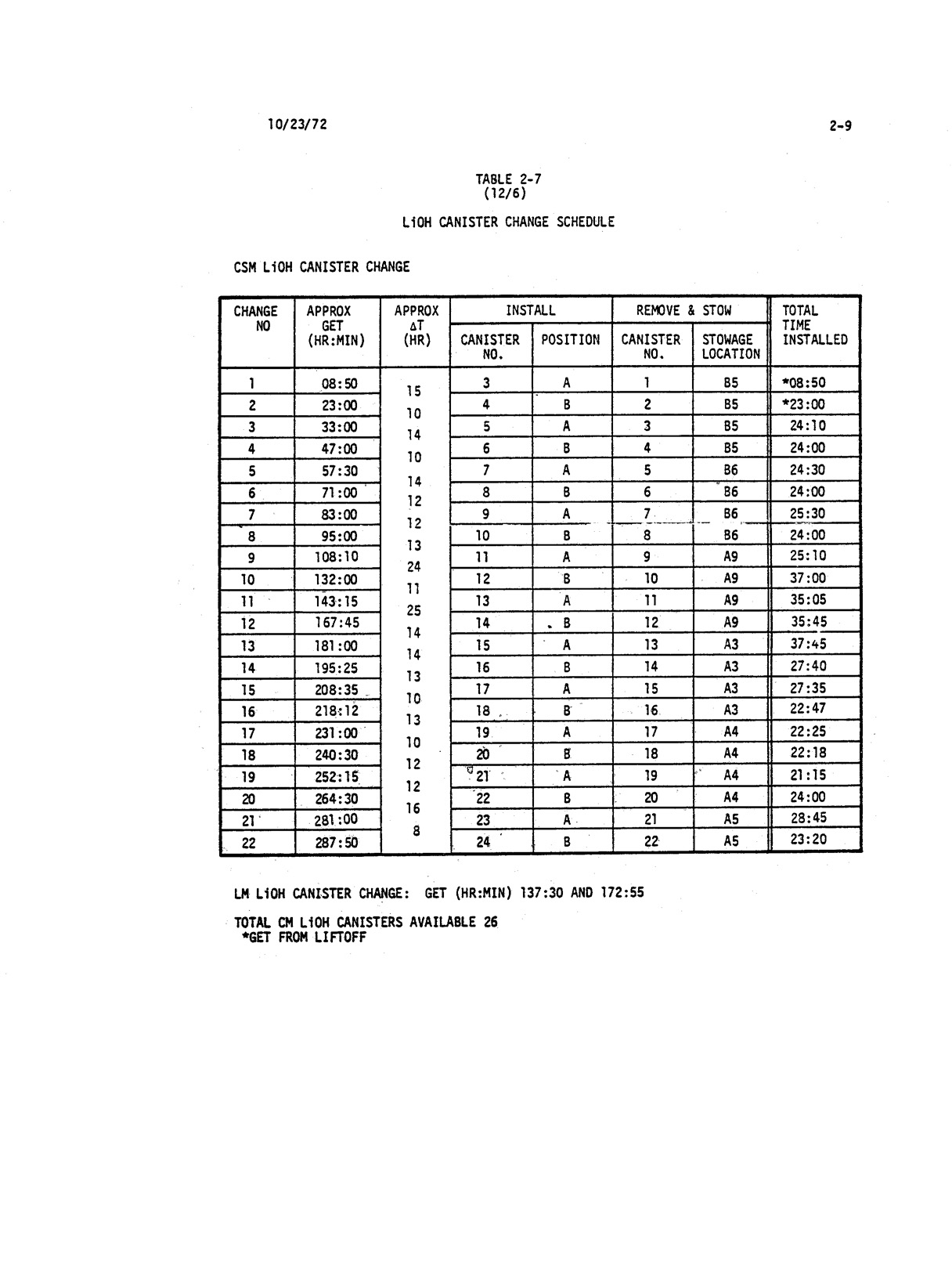 - 2-009 Table 2-7 - LiOH canister change schedule