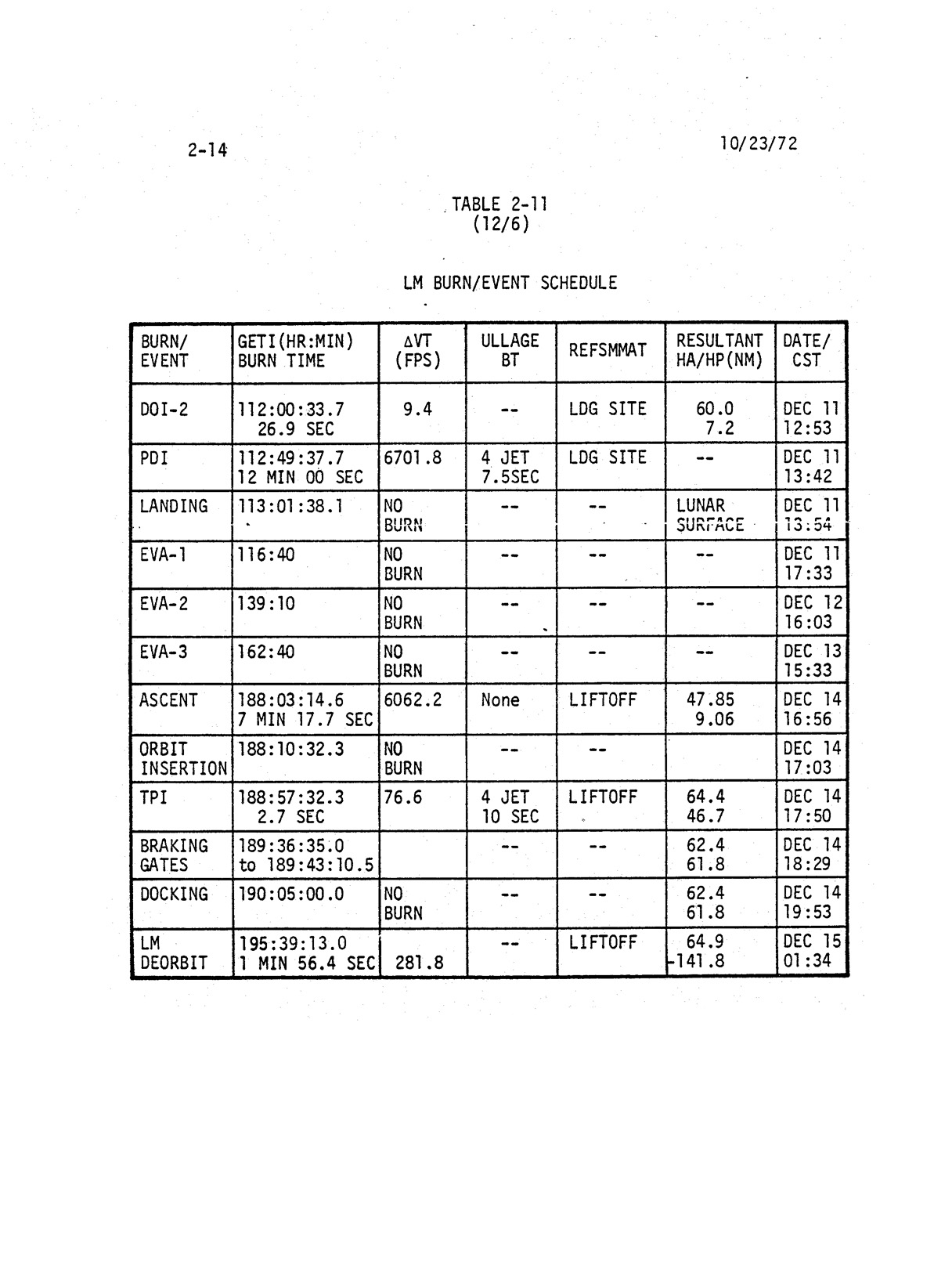 - 2-014 Table 2-11 - LM burn/event schedule