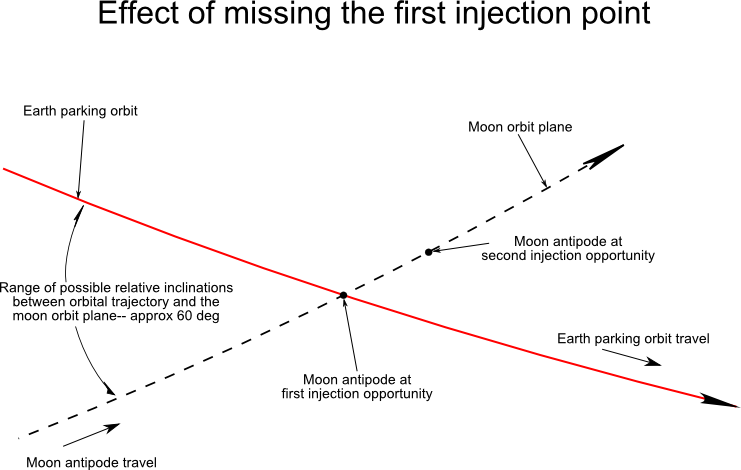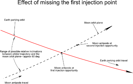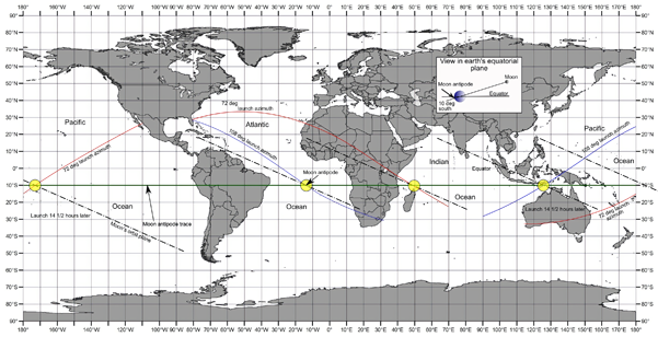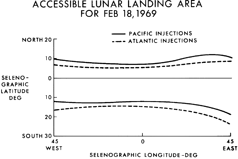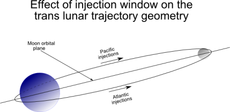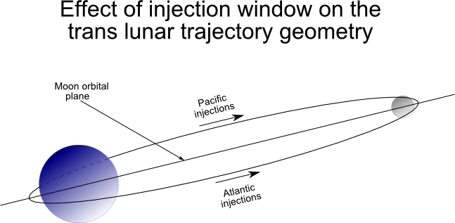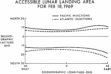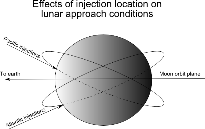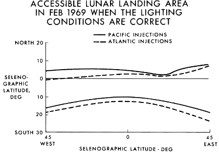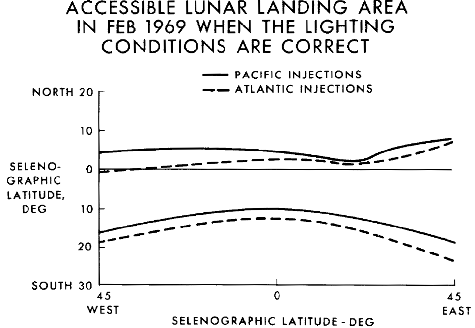 When targeting some landing sites which may be accessible when performance considerations are taken into account, a daylight launch may not be possible for the entire year for Alantic injections. Also winter launches for Pacific injections were greatly limited due to the length of available daylight each day. In some years a combination of performance limitations and the daylight launch constraint combine to eliminate virtually all available launch windows. For the early Apollo lunar landing missions which had the scope to land a more than one site, which therefore would require up to a five day launch window, if these sites were south of the lunar equator, only the spring and early summer months would provide daylight only launch window opportunities. For sites located north of the lunar equator a five day daylight launch window would normally be available throughout the year if the Pacific injection was employed.