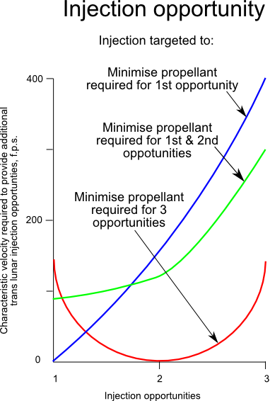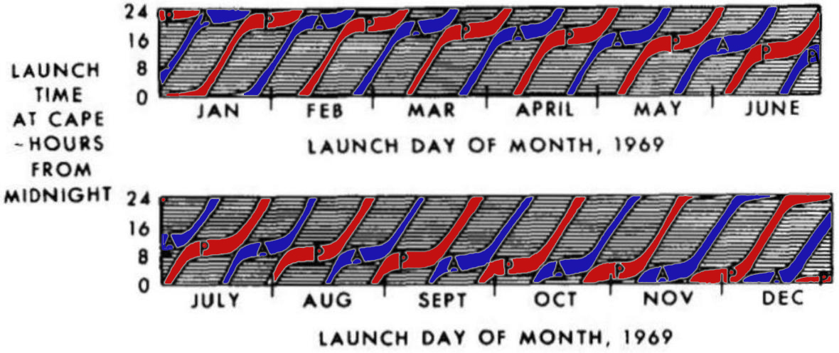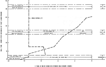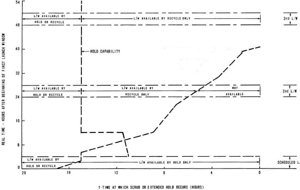 As the graph above shows, if the mission was scrubbed after the countdown had reached T-6 hours, the minimum time to recycle was in excess of 24 hours, and was as long as 40 hours at T=0. Thus, a minimum launch window required to guarantee a recycle capability is 3 days. This did not allow any additional time for repairs or replacing components. If this activity could not be carried out in parallel with the recycling, 3 days would not be sufficient. Therefore, a window of only 3 days duration was not desirable, but was considered a workable minimum in some situations. In order to provide time for repairs to be carried out and still make the monthly launch window, it had to be as long as possible. Another Bellcomm Labs study from the mid 1960's, indicated that the probability of a successful launch was between 85% and 90% if a 3 day launch window was available, and that this probability increases to about 95% if the launch window is of 5 days duration. Based on this data, the early lunar landing missions were planned only for those periods when at least a 3 day launch window existed, and every effort was made to provide a 5 day launch window.