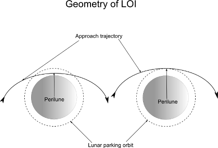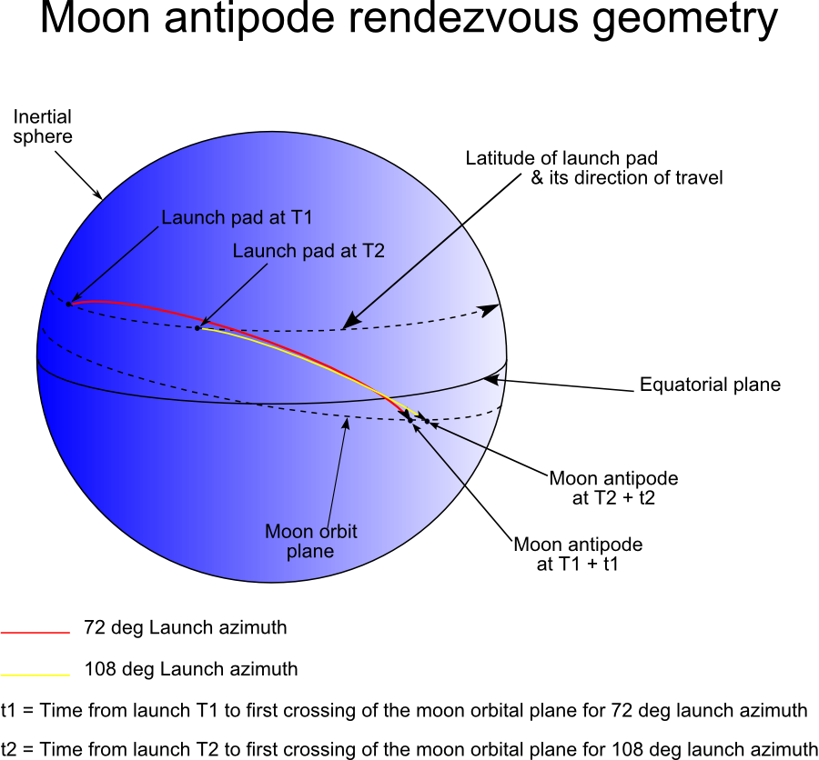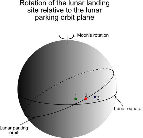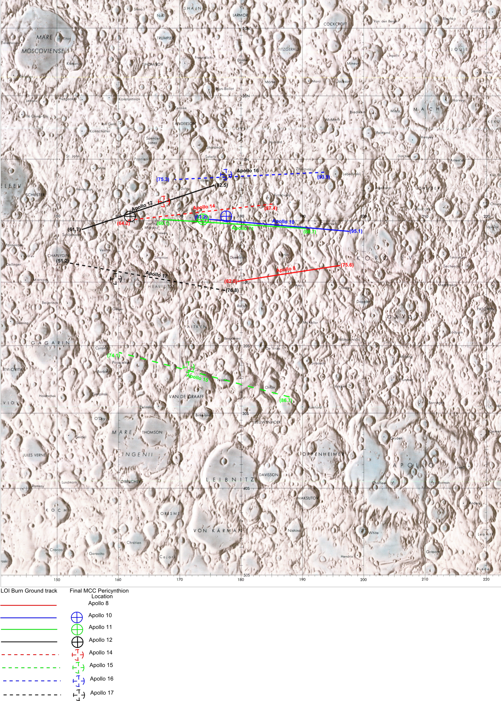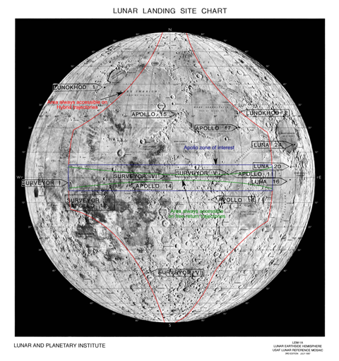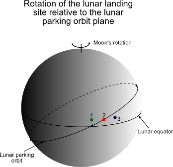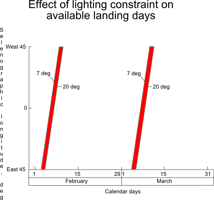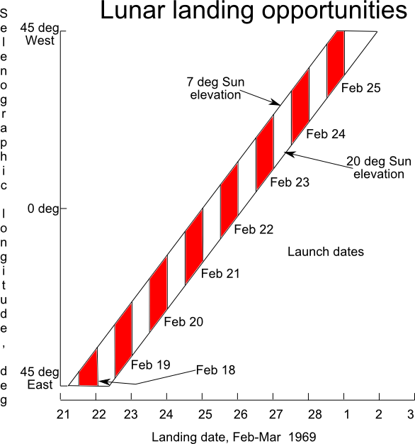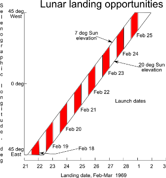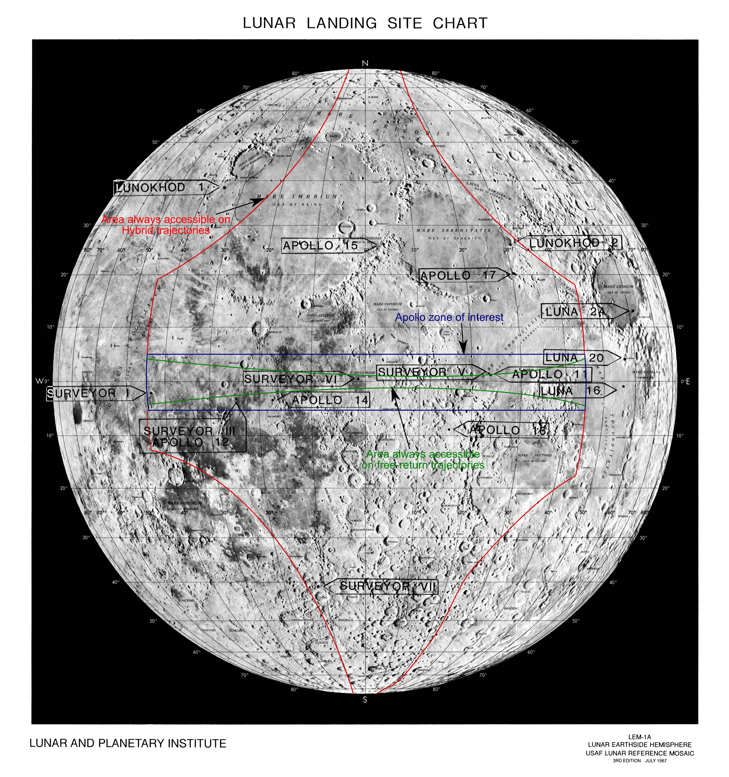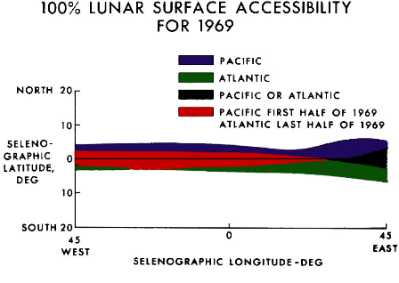 So you can now see that a variety of constraints come together to limit both the times at which a lunar landing launch can occur and the area of the moon that was accessable to the Apollo spacecraft. Careful analysis of the mission requirements coupled with detailed flight planning and real time analysis, combined to allow the mission planners to extract the maximum performance out of the Apollo Saturn space vehicle. This planning paid dividends when preflight and inflight anomalies occurred allowing the flight teams to delay flight events, trouble shoot the anomalies and make plans to correct or bypass the faults and continue using new procedures and an amended flight plan, normally to a successful landing (with the exception of Apollo 13).