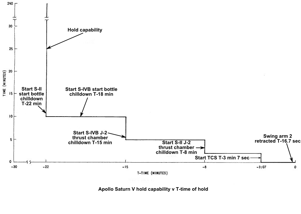 The terminal countdown commences at T-45 minutes, at which time the Apollo spacecraft radio frequency systems. The main items that define the hold and recycle capability during the terminal countdown were the thermal redline limits and J-2 engine pre-launch sequences. The hold and recycle limitations after T-22 minutes are quite severe.