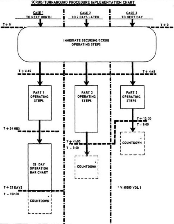 The scrub turnaround process was preplanned. The procedures assumed that any space vehicle repairs necessary following the launch scrub could take place in parallel with the turnaround process. If they could not, a longer turnaround duration would have to be put in place. The launch operations management had to decide, in real time, the actions that were required for the particular scrub scenario they dealing with, i.e. the cause of the scrub and the time in the launch countdown that the scrub was declared. It was possible to authorise waivers to some of the procedures planned in the turnaround, if the real time decision dictated it.