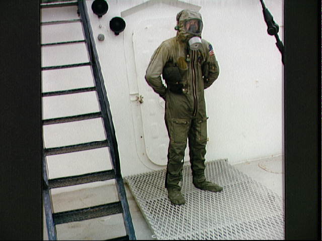 A heavy duty protective suit known as the BIG (Biological Isolation Garment) was designed to contain the crew during the first moments back on Earth. It consisted of a Nylon jumpsuit that covered the body entirely, with an integrated breathing mask that filtered the air exhaled by the crew. The astronauts would wear these as they waited to be picked up by the helicopter and transported to the recovery ship.
