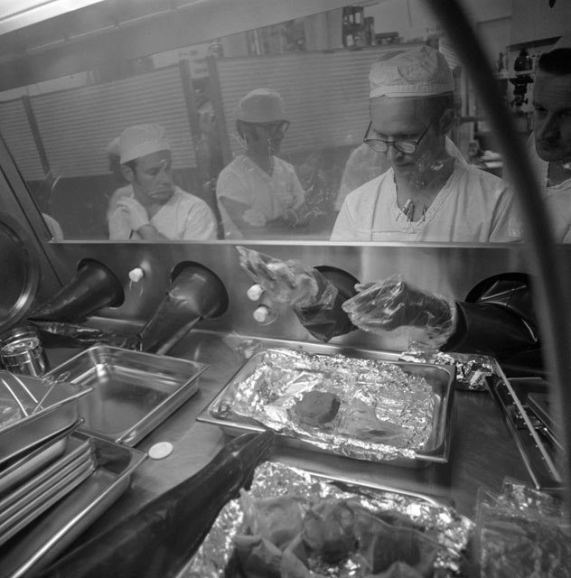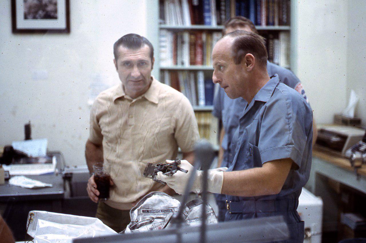 Pete Conrad unbags the Surveyor components. Judging by the fact that Dick Gordon is drinking Coke while Pete Conrad handles the Surveyor lander parts, the crew was not particularly worried about being harmed by lunar dust.
