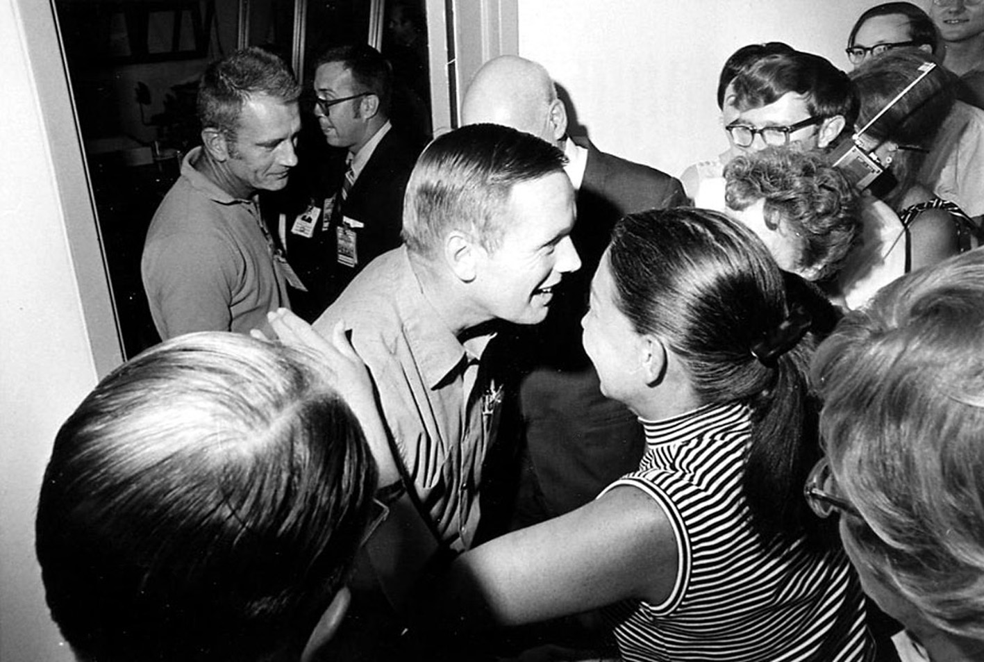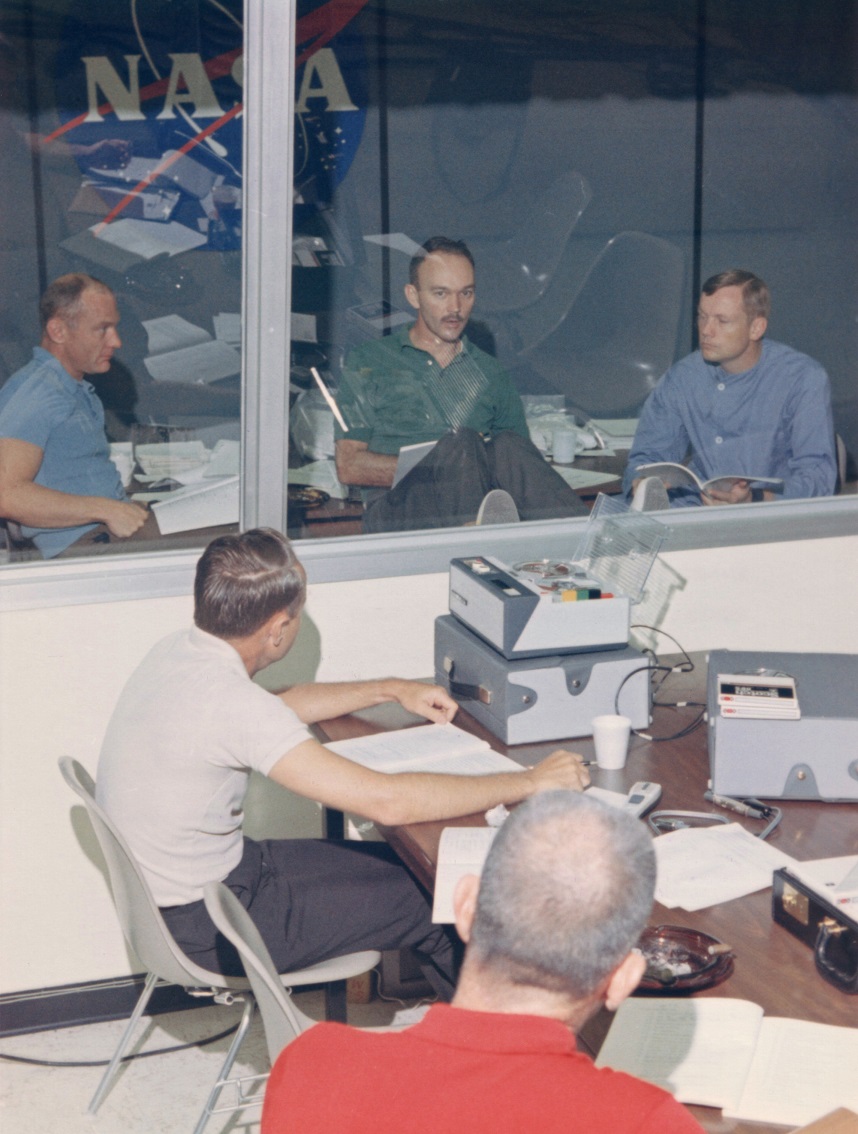 Debriefing at the LRL. Debriefing of the crew commenced almost as soon as they arrived. The interviews were presided over by Deke Slayton, the Director of Flight Operations. Although this was an important event, the relaxed poses suggest that things were not taken too seriously.