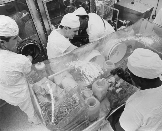 Samples of lunar soil were prepared inside isolation cabinets for use in the biological experiments. They were completely separated from the laboratory space outside, accessed through glove ports, and filled with inert nitrogen to ensure sterility.