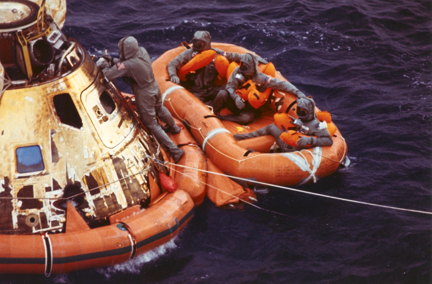 Rescue divers jumping down to the sea from a helicopter became the first line of biological defense as well. After securing the Command Module with a flotation ring, the divers, clad in protective gear of their own, would pass biohazard gear to the crew inside the Command Module. Chemicals would be used to disinfect the exterior of the Command Module.