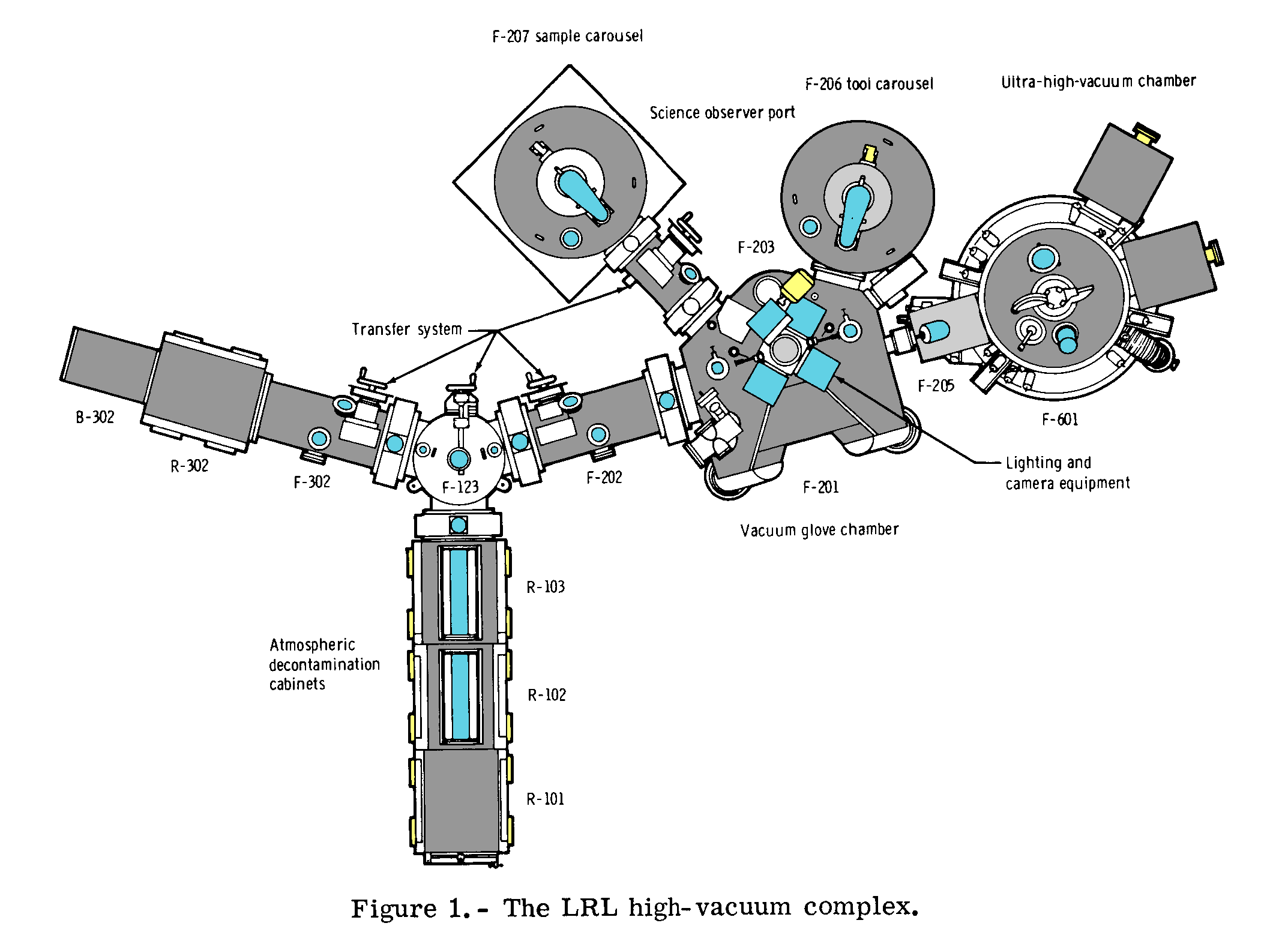 The High Vacuum Complex was a very intricate, state of the art piece of equipment. At its core was the F-201 Glove Chamber, where most of the sample preparation and investigation work happened. All equipment and materials entering and leaving the High Vacuum Complex had to do so through the adjoining atmospheric decontamination cabinets. Here items were first sterilized with peracetic acid, followed by hot nitrogen and then a 160°-Celsius bake out. Only then could any objects be moved into the actual F-201 chamber for handling. A two-pronged transfer system with air locks and a monorail transfer system that could be operated from the outside was used to move the sterilized samples inside the High Vacuum Complex. This system particularly was found to be very temperamental, with items repeatedly getting stuck inside the transfer section. It was deemed too convoluted for the purpose needed, but there was no time nor money to make any changes. The primary reason for the unnecessary complexity was that it had originally been envisioned that the single decontamination airlock cabinetry could service two separate High Vacuum Complexes joined by the transfer section. A budget cut slashed out the second High Vacuum Complex, leaving them with one Complex and the rickety transfer system.