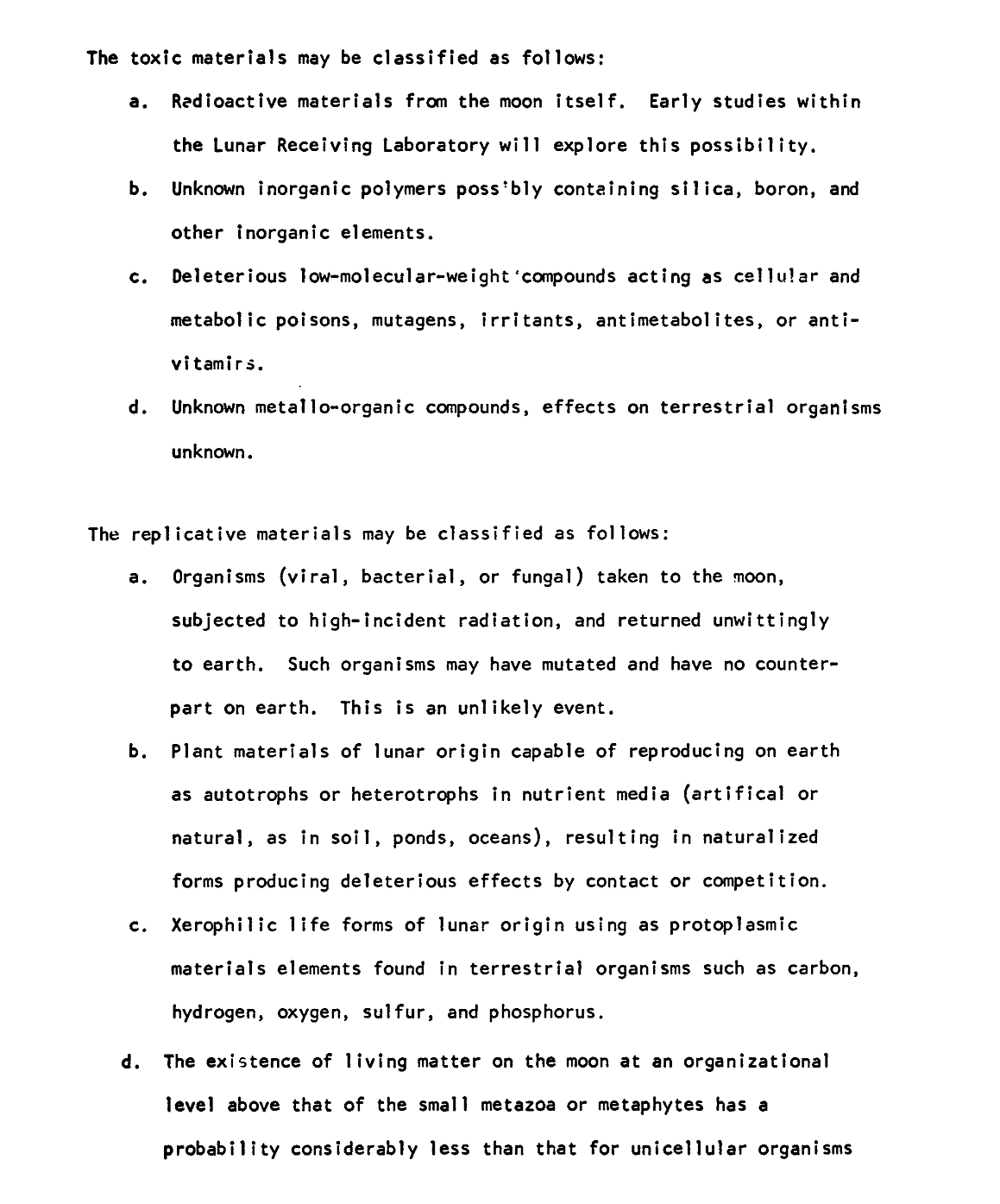 Although it was indeed considered to be a remote possibility that lunar material was harmful to Earth life, a list of potential dangers was drawn up. The lunar rocks themselves could be dangerous, composed of toxic metals or chemical compounds with unknown effects on the biological systems and the physiological machinery of Earth's organisms. Although such toxicities would certainly be contained with relatively simple procedures, they would pose a risk to anyone coming into contact with the material. This was not including the indeed minuscule, but not infinitely impossible chance that life forms could survive on the Moon. It was still a possibility that these most likely microscopic life forms could either be directly harmful, or become the ultimate invasive species by thriving all too well in Earth's biosphere, replacing the native plant and animal life.