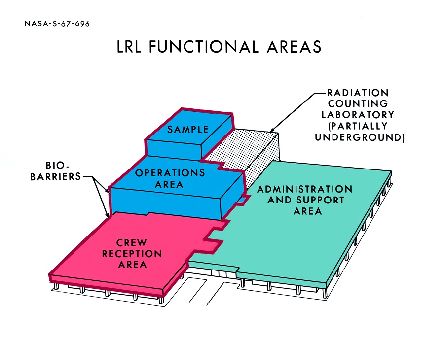 The LRL was divided into three primary sections, each with their own mission. The Crew Reception Area (CRA) would house the three Apollo astronauts, their MQF support staff, and the actual Apollo Command Module for the duration of the isolation. Directly adjoining it was the Sample Operations Area, which could be roughly divided into three primary areas of its own. It was here that the lunar samples were examined and contained, protecting both the personnel and the samples themselves. A special part of the Sample Operations Area was the Radiation Counting Laboratory. It was located mostly underground to shield it from background radiation, and was used for radiological studies of the lunar samples. The third section was the Administration and Support Area. Adjunct staff worked here, and had no direct contact with the isolated materials or personnel.