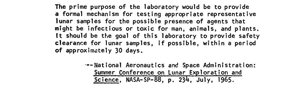 Biomedical Results of Apollo (SP-348, 1975) is an overview on the medical aspects of the Apollo program, including the medical and biological research conducted before, during and after the missions. It has fine chapters on the LRL and the quarantine program and the biological challenge and analysis programs conducted to ensure the safety of the lunar samples.