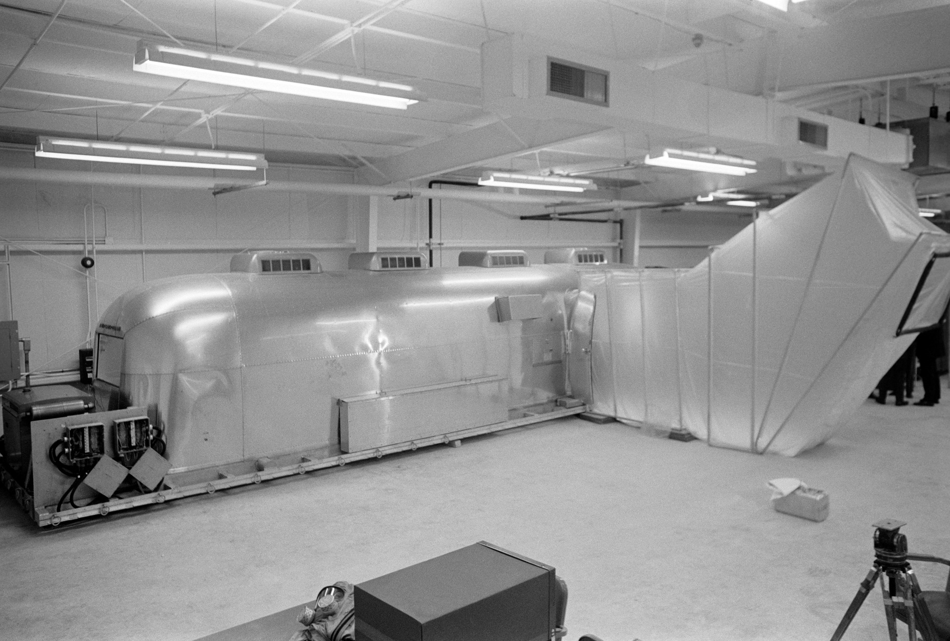 It would take a while for the crew to reach Houston and their ultimate destination at the Lunar Receiving Laboratory. It was determined that the most practical and secure way to isolate them for the return trip was to provide them with a mobile confinement unit. This would house them and their support personnel until arrival at the LRL. A sealed, self-contained system was developed for this purpose and became known as the Mobile Quarantine Facility. It could be transported via sea, air and road and protected the environment from exposure to the potentially contagious crew and the lunar samples.
