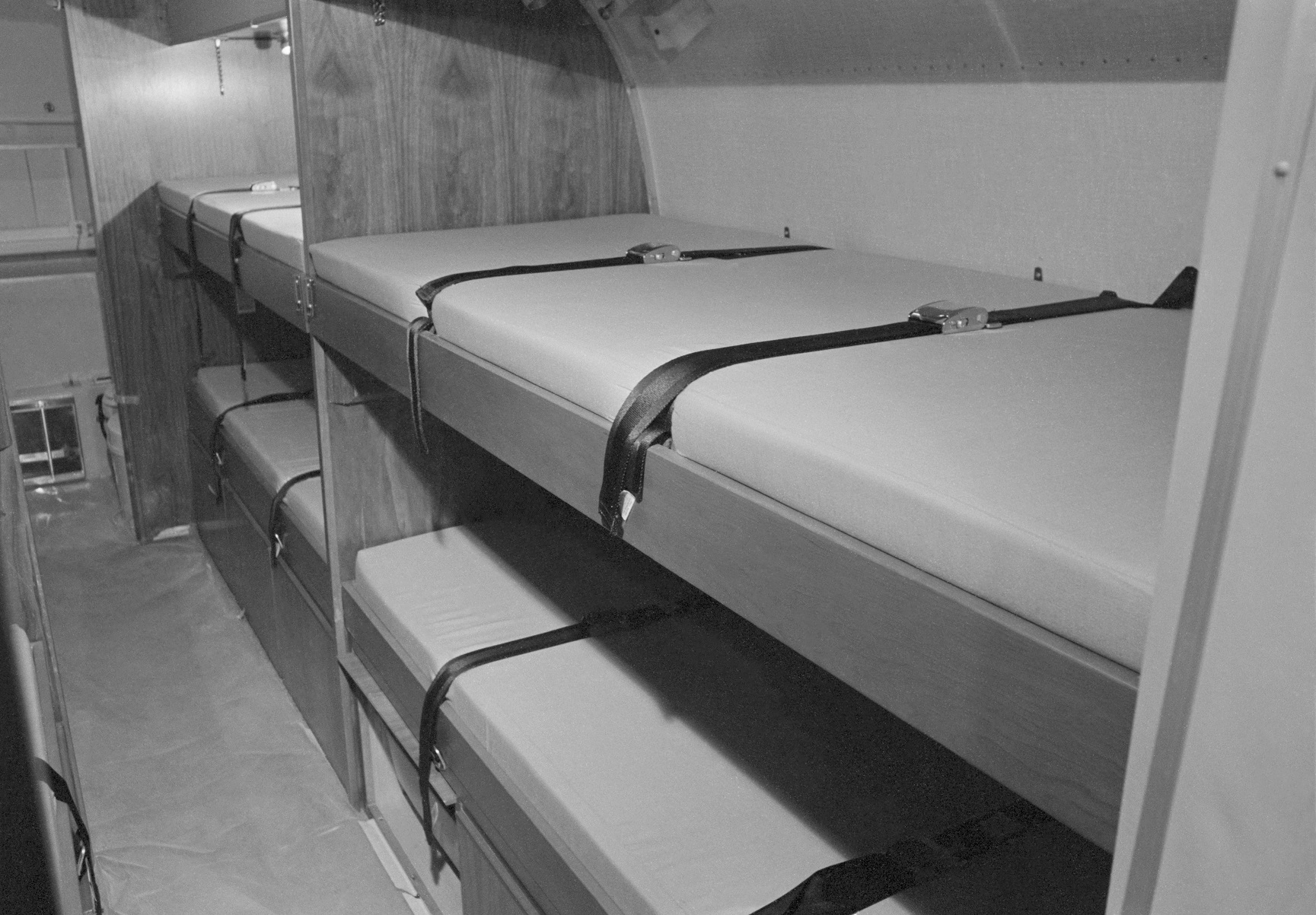 Spartan sleeping quarters were provided for six people in the MQF. The bunk beds were equipped with restraints and oxygen masks for in-flight emergencies.