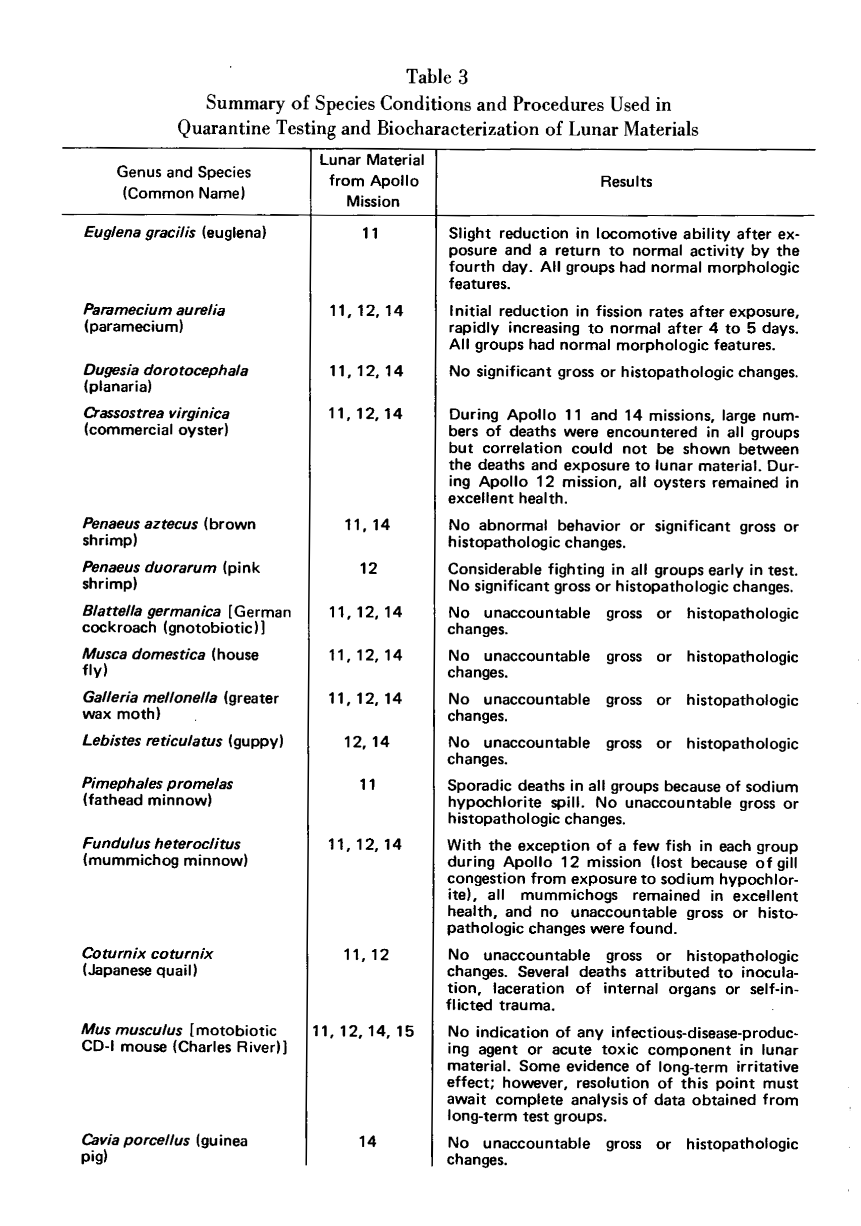 All animal testing results were found to be negative. Although there were many deaths among the test animals, they were attributed to accidental exposure to disinfection agents such as bleach. Several inflammatory responses were recorded in the test animals exposed to the lunar material, but none of these reactions could be considered unusual in terms of normal physiological response to foreign material in a normally sterile body cavity.