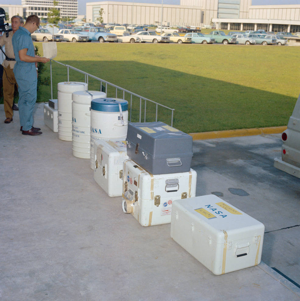 As per the plan, the accordion tunnel was attached and the lunar sample containers, biological samples, film canisters, and the data tapes from the onboard recorders were removed. These were later passed through the sterilization airlock in the MQF to the carrier crew, and sent by two different planes to Houston in order to hurry the samples for analysis.