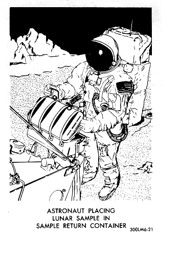 Apollo training illustration of an astronaut working at the sample container. The samples were enclosed in the return containers while outside the spacecraft. After the moonwalk, the boxes were moved into the cabin and then placed into the Command Module after docking.