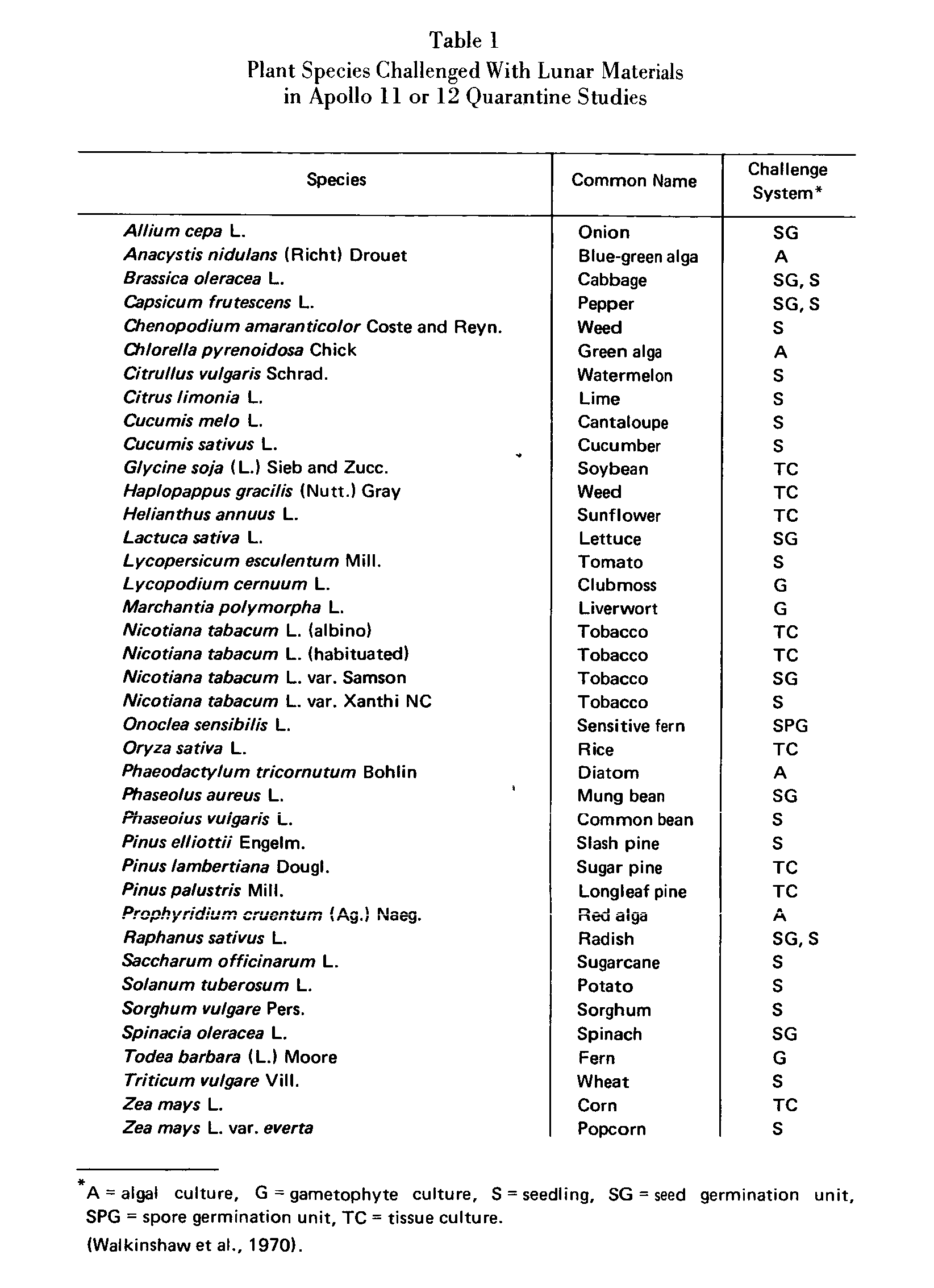 The plant species used for the biological challenge were selected on the basis of being representative of various forms of plant life found from Earth, as well as their importance to the world economy. The most important food crops, for example, have been so heavily cross bred throughout the centuries to maximise productivity that consequently the species have grown more sensitive to infection. A single particularly virulent pathogen could potentially destroy every single example of the species. Should it have been revealed that lunar material had the potential to do such damage, the results could have been disastrous. Hence crops like wheat and corn as well as tobacco and potato were included in the biological test program.