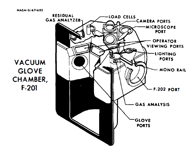 The F-201 Glove Chamber allowed technicians and scientists to examine and study the lunar samples while maintaining them in the vacuum environment. Equipment inside was provided for photography and surface examination of each sample. The extremely stiff, cumbersome gloves meant that the chamber operators became fatigued quickly. A 15-minute time limit for each operator was instated to ensure that nobody would tire too easily.