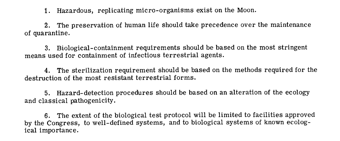 With all this in mind, the basic guidelines were eventually drawn. Although most accepted that the likelihood of life on the Moon was very slim, the quarantine would have to start from the assumption that life did indeed exist, and it could be harmful. Human life should come first in terms of protection, whether that meant the astronauts or the general public. Since it was impossible to guess what kind of life existed on another world such as the Moon, all planning for the biological protection should be made based on knowledge of Earth's own life forms. If a sterilization procedure, for example, would render Earth life forms inert, it would have to be assumed to have a similar effect on Moon's life forms as well. The final tenet suggested was again legislative, and financial as well. Money should be considered, even on a plan like this.