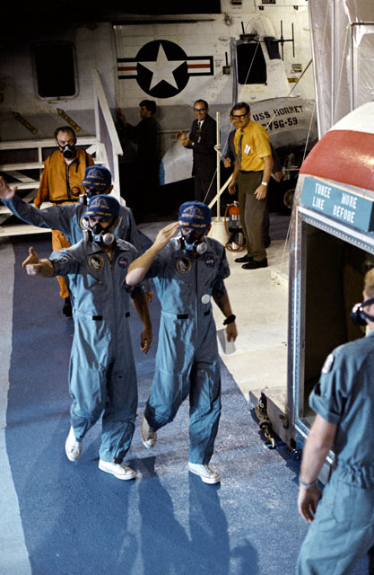 Pete, Dick and Alan salute the cheering crowd as they walk to the MQF. The sign above the MQF door says "THREE MORE LIKE BEFORE", in reference to the 'Hornet +3' slogan during the Apollo 11 recovery.