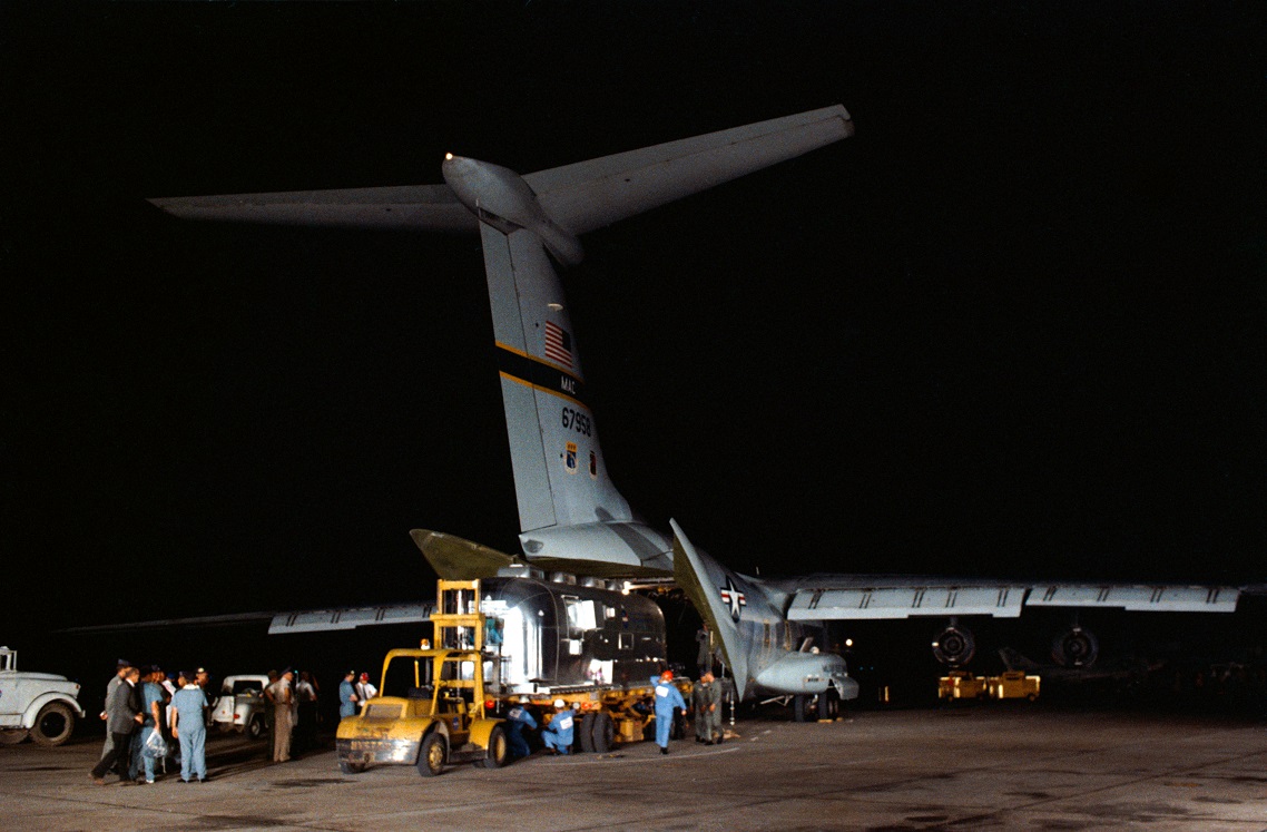 The Apollo 11 MQF removed from the C-141 Starlifter aircraft.