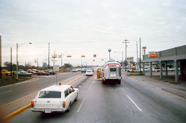 The MQF containing the crew of Apollo 12 makes its way from Ellington Air Force Base to the Manned Spaceflight Center and the LRL.