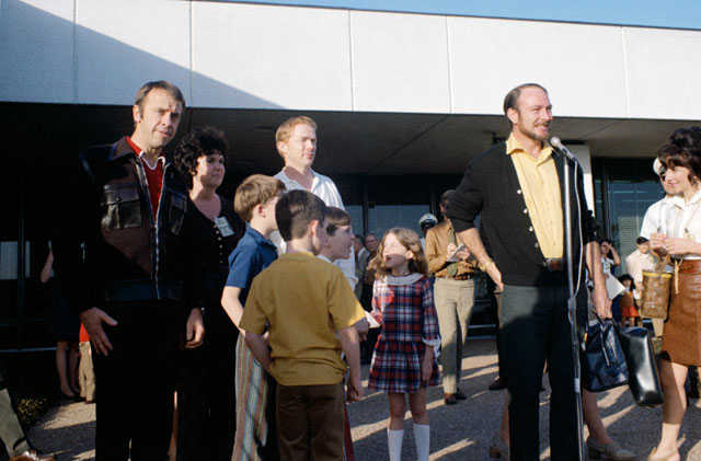End of one era - the last quarantined crew photographed just after release, outside the LRL. Family members accompanied the crew of Apollo 14 for their appearance outside Building 37.
