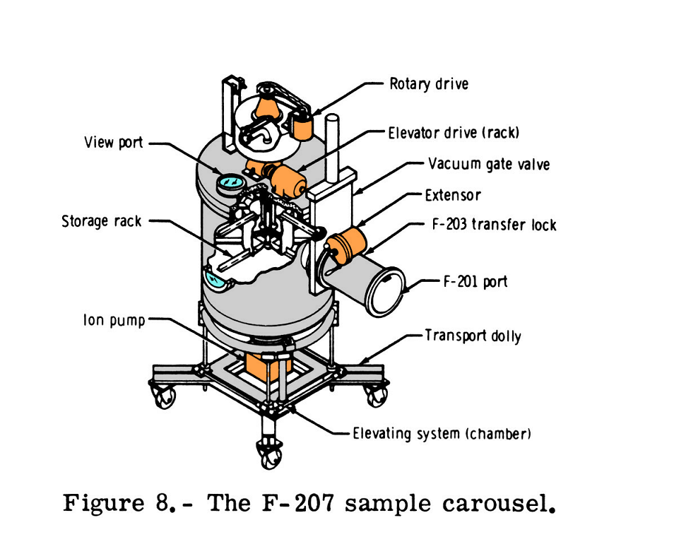 Samples and equipment could also be taken in and out of the High Vacuum Complex with the transfer carousels. They consisted of a portable vacuum chamber with its own pumping equipment to maintain the vacuum inside the container.