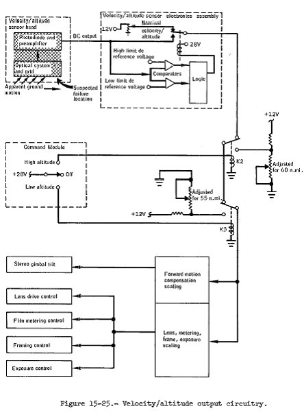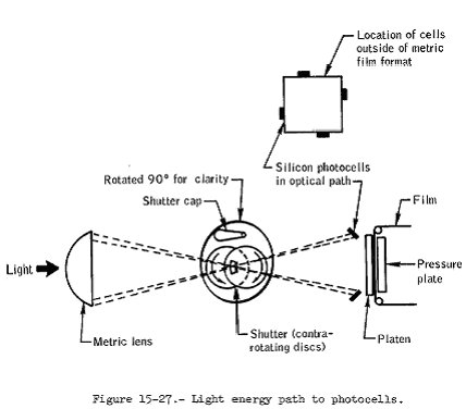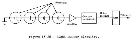All four diodes are connected in series. (Figure 15-26.) Light sensor circuitry. During Apollo 15 and 16, this pulse was absent only at the very low light levels, thereby indicating that the Apollo 17 discrepancy may have been due to a threshold shift in the light sensor circuitry. A 50-foot strip of metric photography from revolution 62 was processed in order to establish whether this was the case or some other problem was actually reducing the light being transmitted to the film. The test strip indicated that the film had been properly exposed, thus indicating that the light sensor circuitry had indeed experienced a threshold shift. This shift could have been the result of a photo diode failure or a change in the performance of the amplifier, the one-shot multi-vibrator, or the circuitry between these two elements.