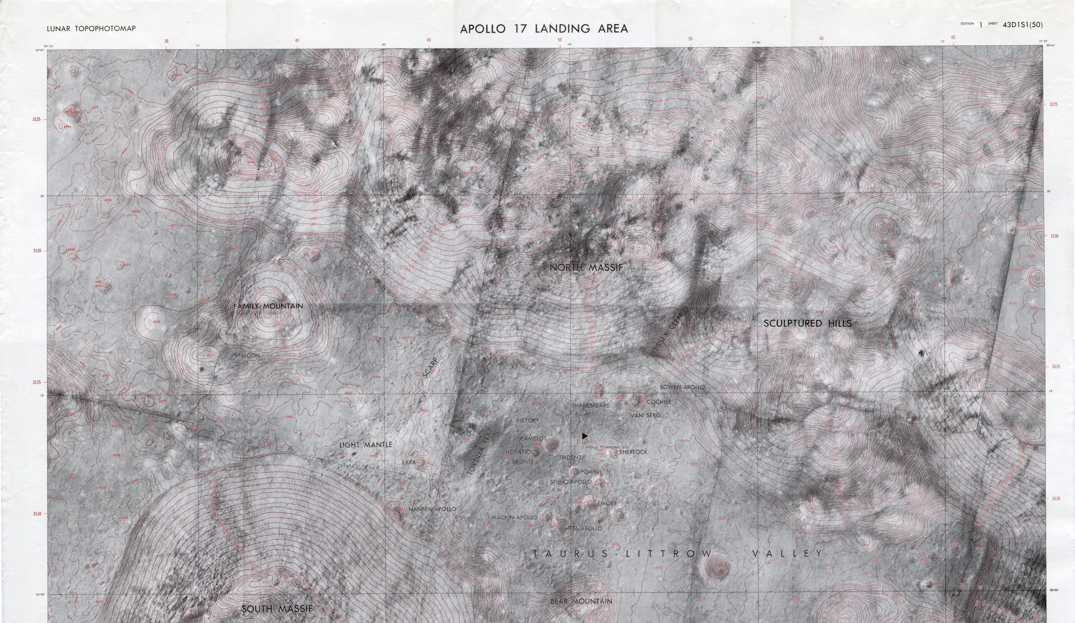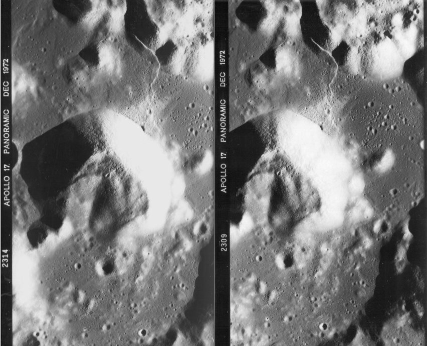 Below is the centre segment from the panoramic frames AS17-2309 & AS17-2314 of the valley of Taurus-Littrow. They represent a 25° convergent stereoscopic pair.