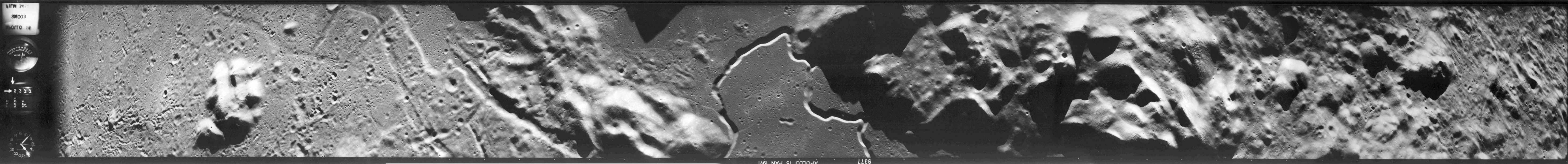 Operated in orbit 69 miles above the lunar surface, the optical bar panoramic camera produced stereo photography covering about 1.9 million square miles, or about 15 percent of the Moon’s surface. Each photographic frame recorded an area 211 miles wide by 13.5 miles long with such fine detail that an object smaller than 6 feet (2m) in size can be examined and its position pinpointed.