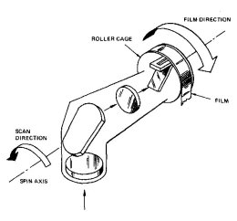 Because the camera lens rotates at a distance from the image surface (the radius of the roller cage) which is not equal to the focal length of the lens, lateral image motions could be introduced. During the exposure cycle, the film is moved across the roller cage in a direction opposite to the lens rotation to compensate for these image motions. The rate of film transport is proportional to the rotation rate of the lens.