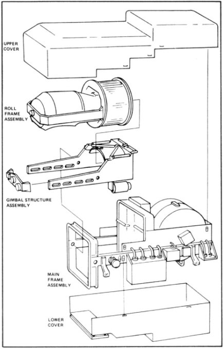 The camera comprises three major assemblies: (1) the roll frame assembly, which basically provides the platform for the rotating lens system, (2) the gimbal structure assembly, which rocks the roll frame assembly back and forth to provide for the stereo photography and to compensate for the forward motion of the vehicle, and (3) the main frame assembly, which attaches to the vehicle and provides a platform for the film transport system as well as the roll frame and gimbal structure assemblies.