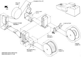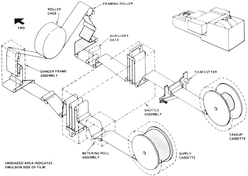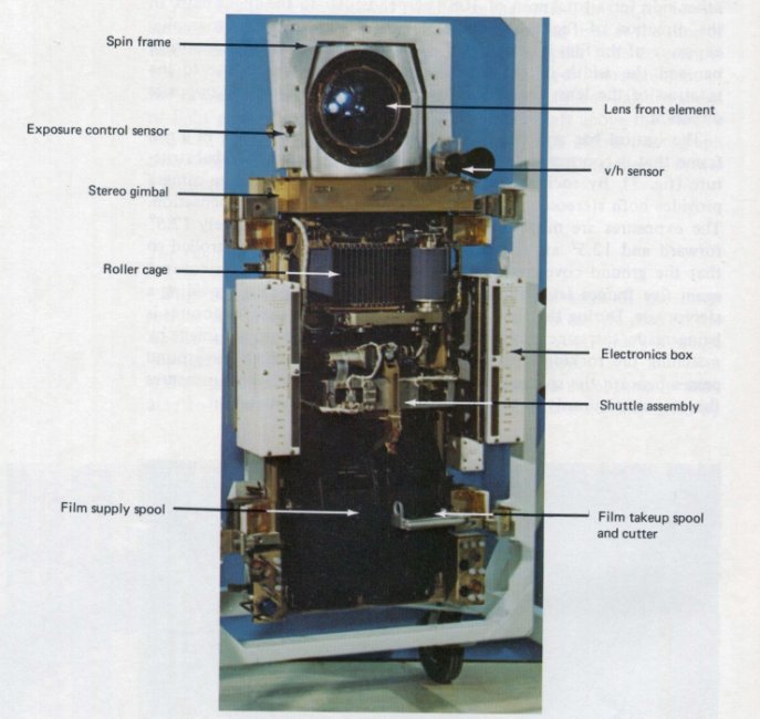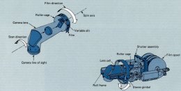 The film metering roller continuously moves film from the supply cassette to a supply shuttle (a system of fixed and suspended rollers which stores a surplus of film ready for use). At a rate synchronized with the cycle rate, a framing roller intermittently draws film across the revolving roller cage in the direction opposite to that of the lens rotation, through the focal plane, and then into a take-up shuttle. The supply shuttle is refilled during that portion of the cycle when the film remains stationary over the roll cage. Film in the take-up shuttle is continuously drawn into the take-up cassette. It takes approximately 2 seconds for each complete exposure during which time 1.2m of film is passed over the roller cage and past the exposure slit. Consecutive frames were exposed every 6 seconds. The surplus film which is intermittently entering and leaving the supply and take-up shuttles provides the flexibility required to maintain constant film tension throughout the system while the gimbal assembly tilts through its stereo and forward motion compensation cycle.