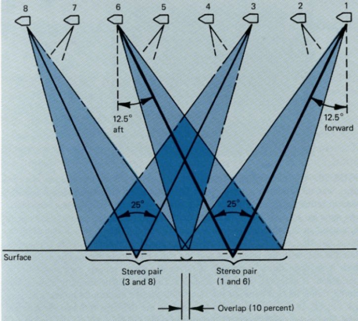 When the camera operates in the stereo mode, the gimbal structure automatically pitches alternately from a position 12.5° forward to 12.5° aft of the vertical between successive exposures. That is, one exposure will begin with the gimbal structure in a position 12.5° forward of vertical, the next exposure will begin with the structure at a position 12.5° aft of vertical, and for the next it will shift to the 12.5° forward position once again. The cycle rate of the camera is set so that a 100 percent overlap between stereo pairs is maintained. When properly viewed, the two photographs of the same ground area thus taken from different angles provide a 25-degree convergent stereo image (see diagram below).