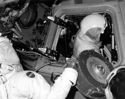 Below is a training photograph of Apollo 17 CMP Ron Evans passing a Panoramic Camera film cassette to LMP Harrison H. Schmitt.