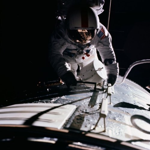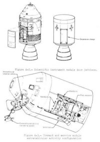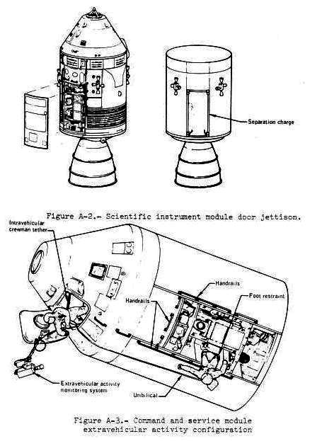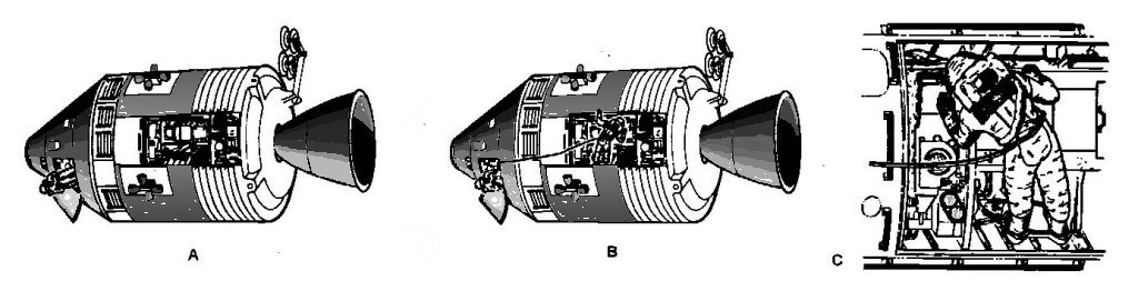 In A, the astronaut (CMP) is shown egressing through the CM hatch. During the EVA, all three astronauts are exposed to the vacuum of space and hence all must wear their spacesuits. In B, the CMP has moved to the vicinity of the SIM bay and is preparing to remove the film cassettes from the Lunar Mapping and Panoramic Camera's. He anchors himself to the spacecraft by inserting his feet into special foot restraints, termed ‘golden slipper’, because they were formerly gold coloured. In C, the EVA astronaut is seen removing the film from the mapping and stellar camera’s in one cassette. Another astronaut (usually the LMP) remains ‘standing’ in the Command Module main hatch, from where he documents the film retrieval procedure with photographs and verbal descriptions. From here he also assists the EVA astronaut during his transfers to the SIM bay and passing the retrieved film cassettes to the third astronaut (usually the CDR) who has remained within the Command Module. The film cassettes are safely stowed within the CM for their return to Earth.