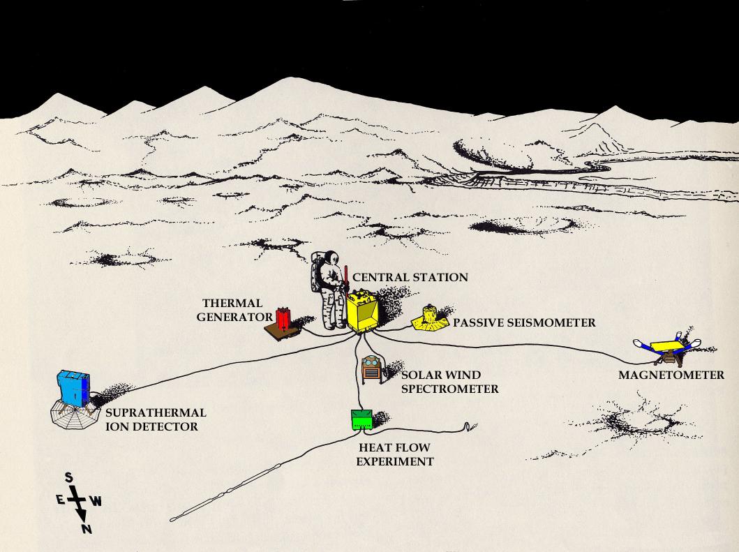 The central station, located 125 meters North West of the LM at 26.13407 N latitude, 3.62981 E longitude, was turned on at 1837 UT on July 31 1971 and shut down on September 30 1977.
