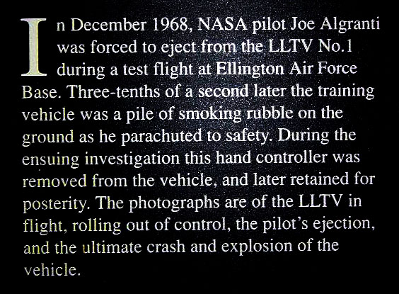 - Rotational Hand Controller ( 87k ) John Osborn writes "This rotational hand controller was recovered from the 8 December 1968 crash of LLTV No. 1. The pilot used it in his right hand to pitch, roll, or yaw the vehicle."