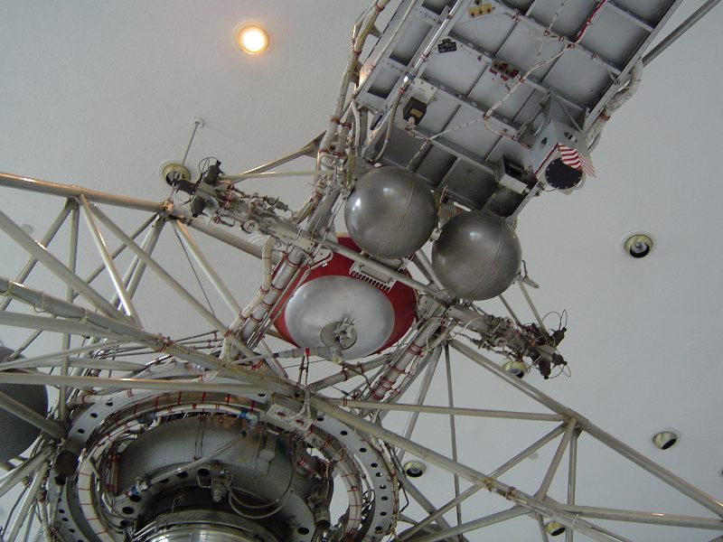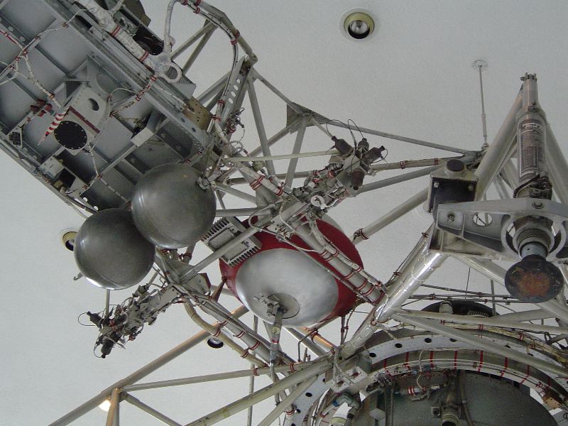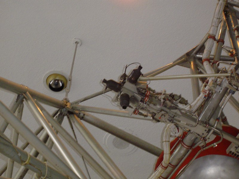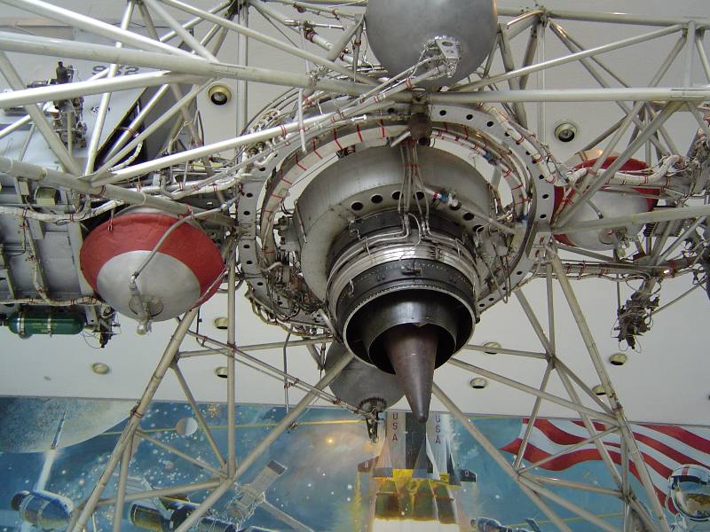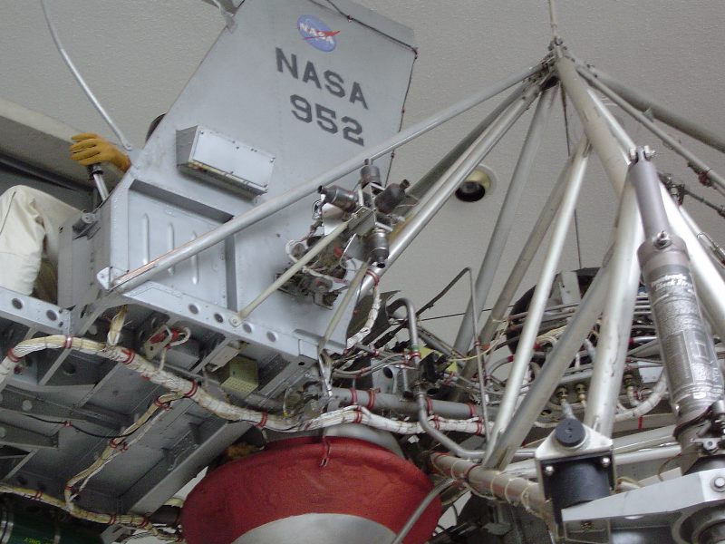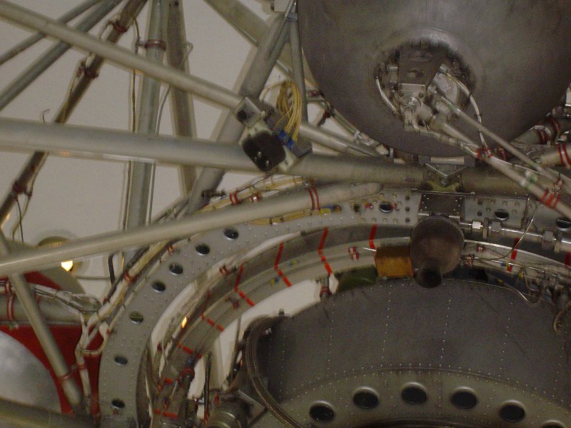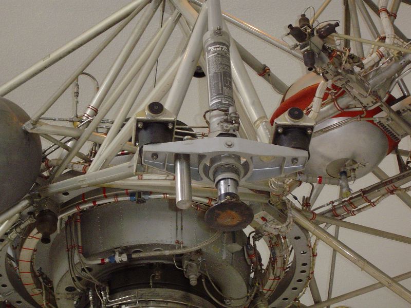 - Underside on the righthand side of the engine ( 95k ) showing some of the gimbal structure. Also showing the underside of the RHS hydrogen peroxide tank and associated piping.