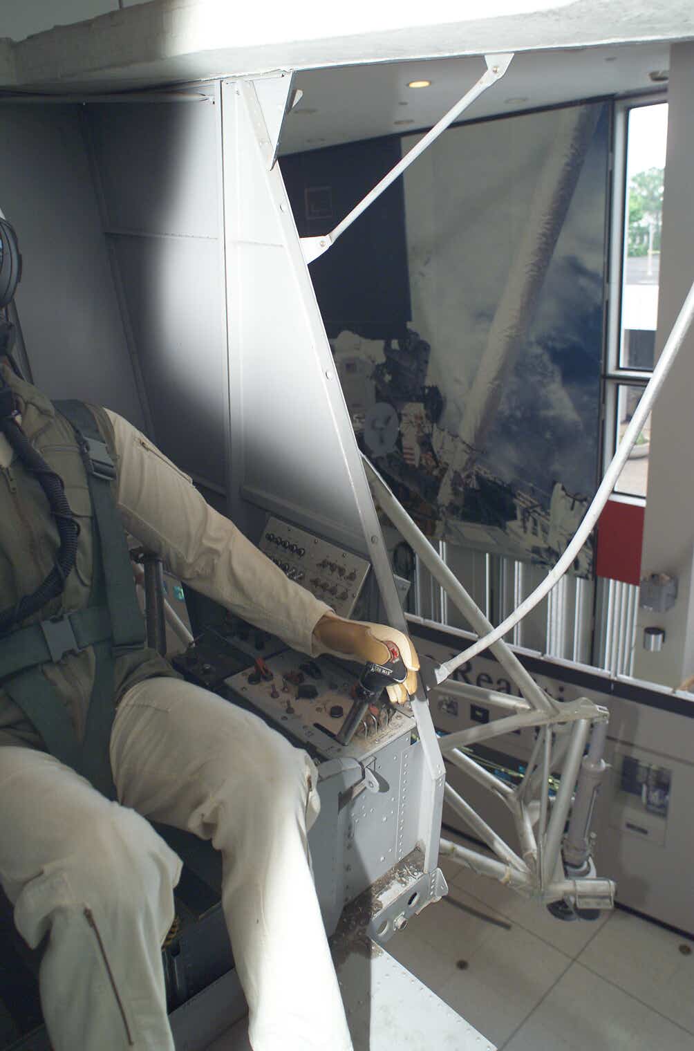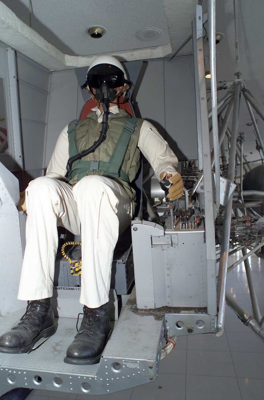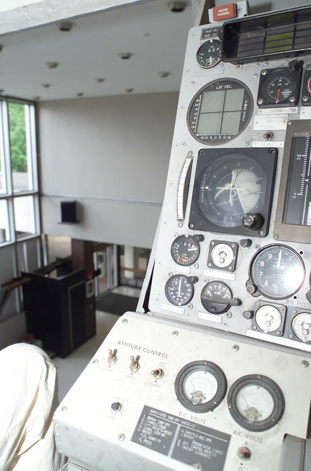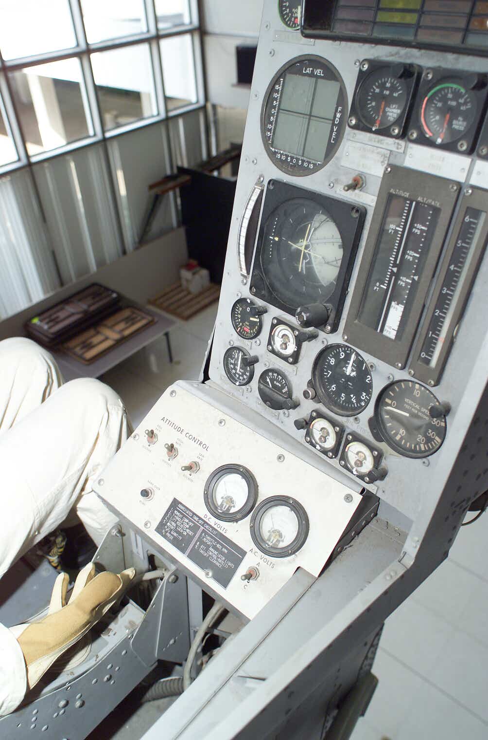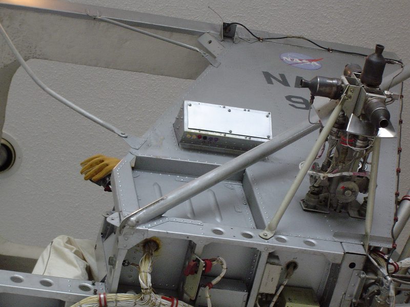 - View from the Front ( 154k ) Note the switch/circuit-breaker box sticking through the wall on manikin's left. This panel corresponds to the panels on the Commander's left in the LM. A set of thrusters can be seen just aft of the cabin and, farther back, one of the grey, spherical JP4 tanks.