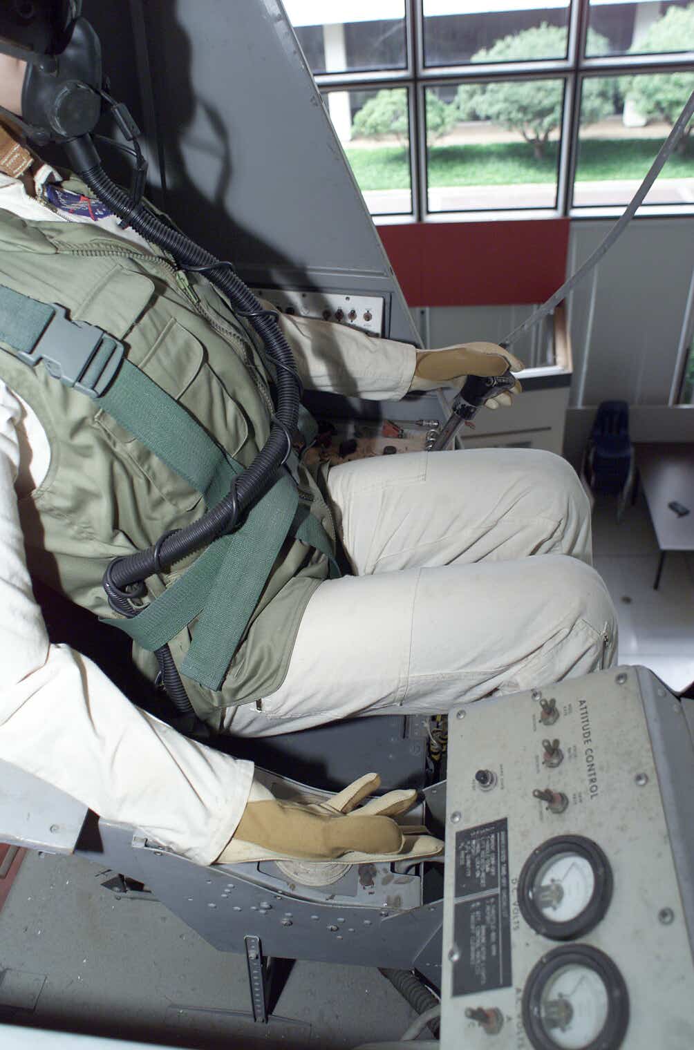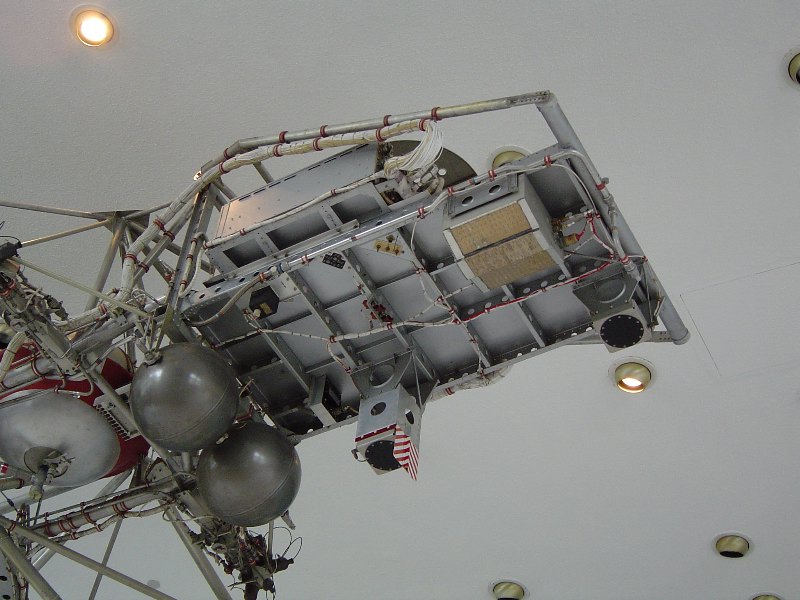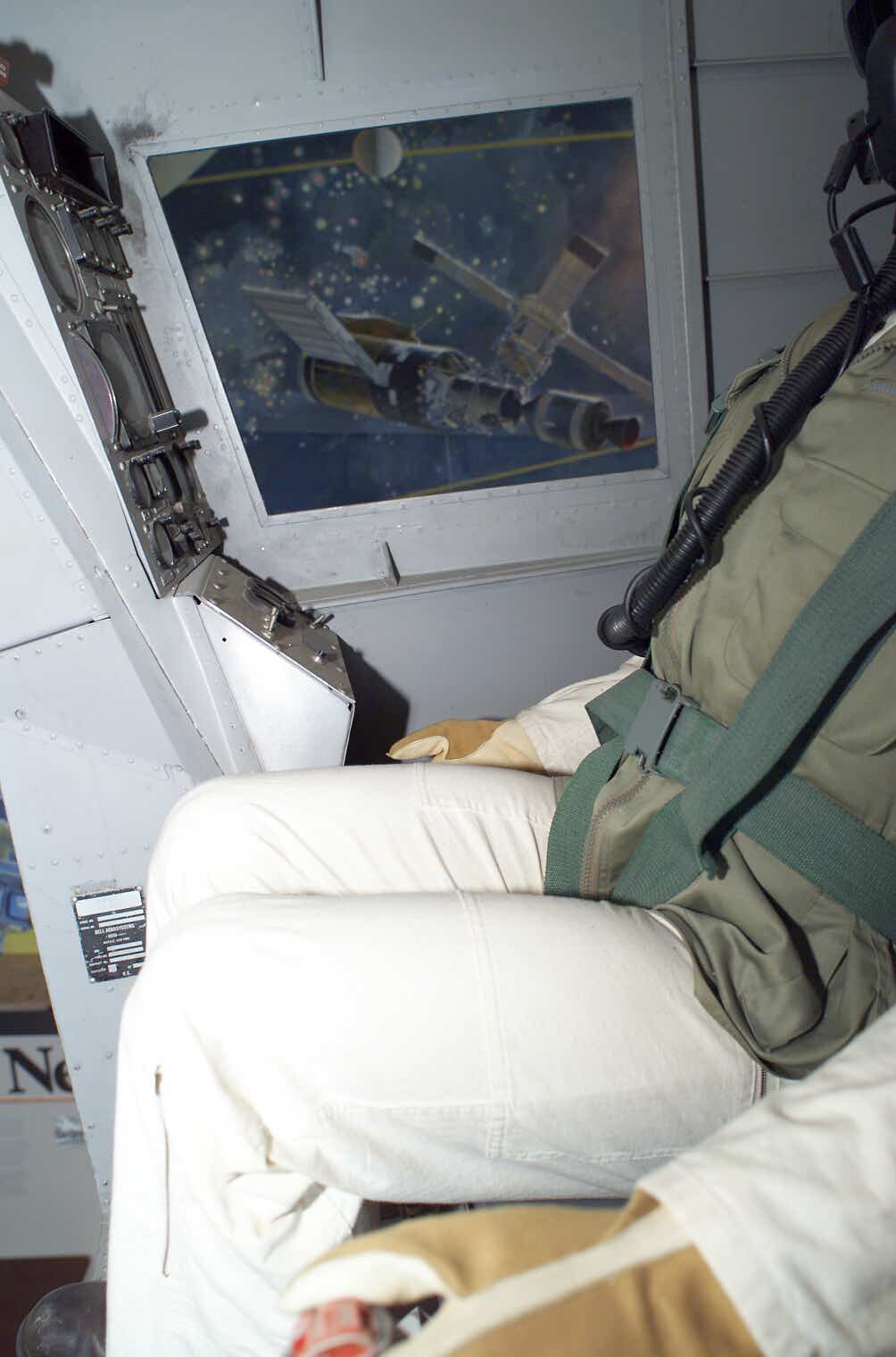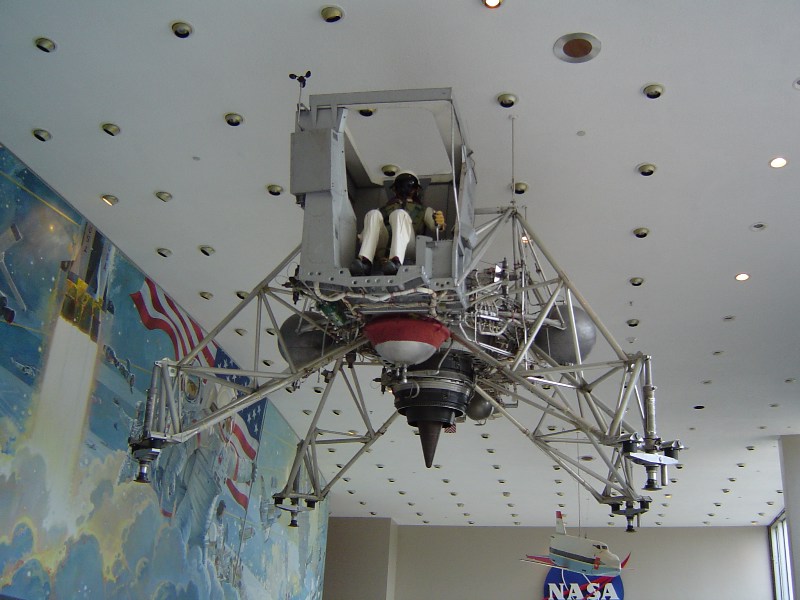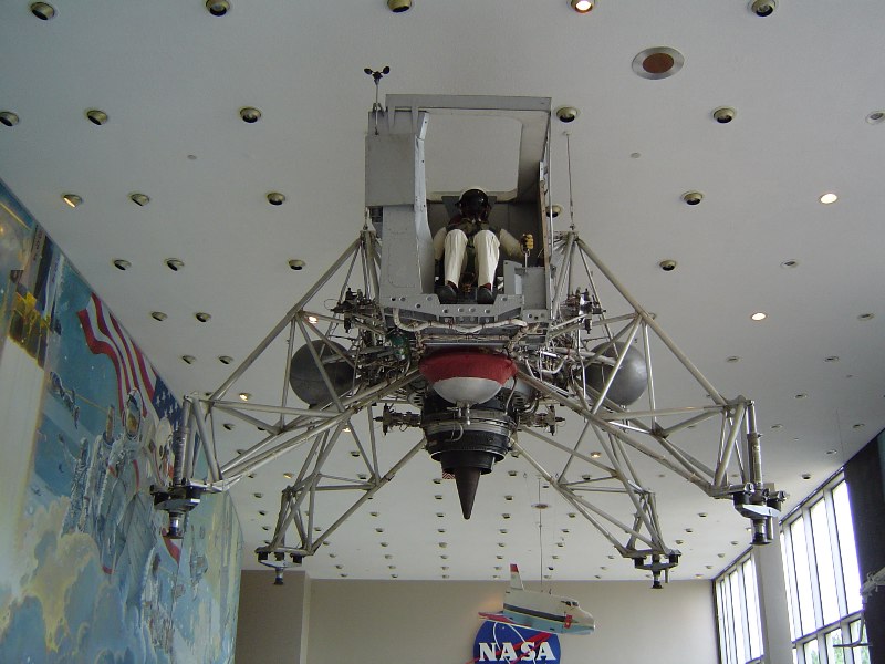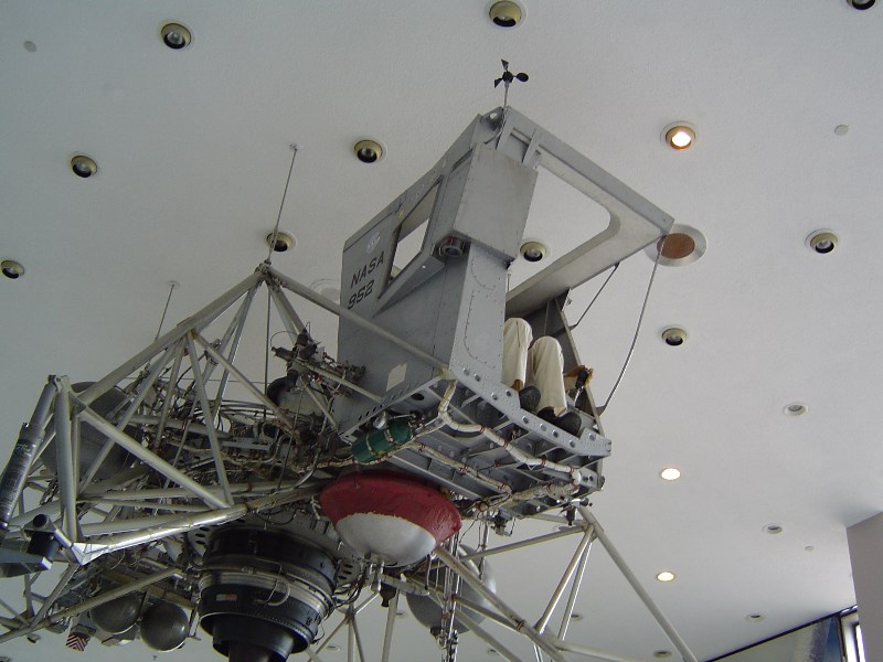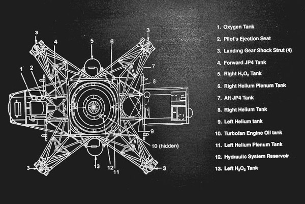 - View from the Front ( 154k ) Note the switch/circuit-breaker box sticking through the wall on manikin's left. This panel corresponds to the panels on the Commander's left in the LM. A set of thrusters can be seen just aft of the cabin and, farther back, one of the grey, spherical JP4 tanks.